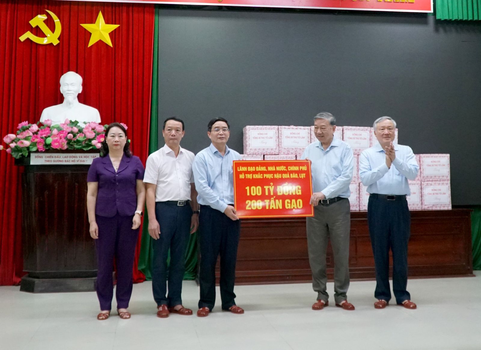 Thay mặt lãnh đạo Đảng, Nhà nước, Tổng Bí thư đã trao 100 tỷ đồng, cùng 200 tấn gạo nhằm hỗ trợ thành phố Huế, sớm vượt qua mưa lũ.