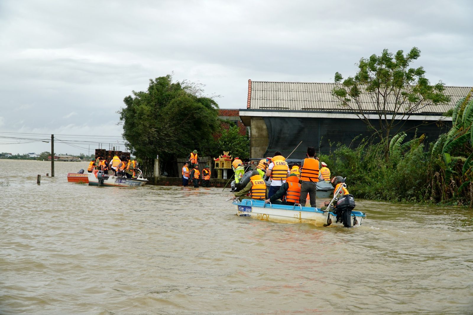 Đoàn công tác dùng xuồng tiếp cận thôn Khuông Phò Đông, xã Quảng Điền, Thành phố Huế - nơi còn đang bị cô lập, chia cắt bởi nước lũ.