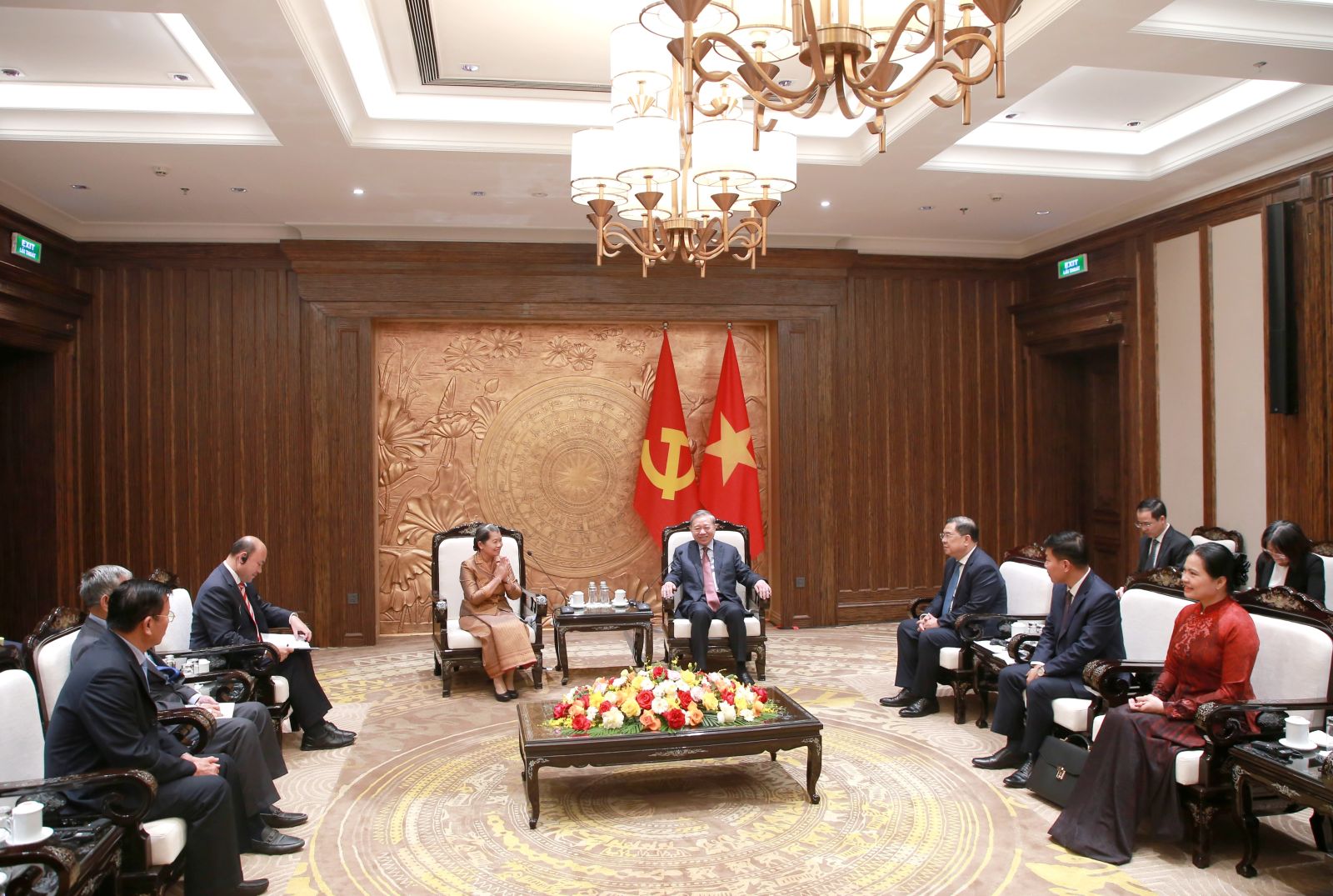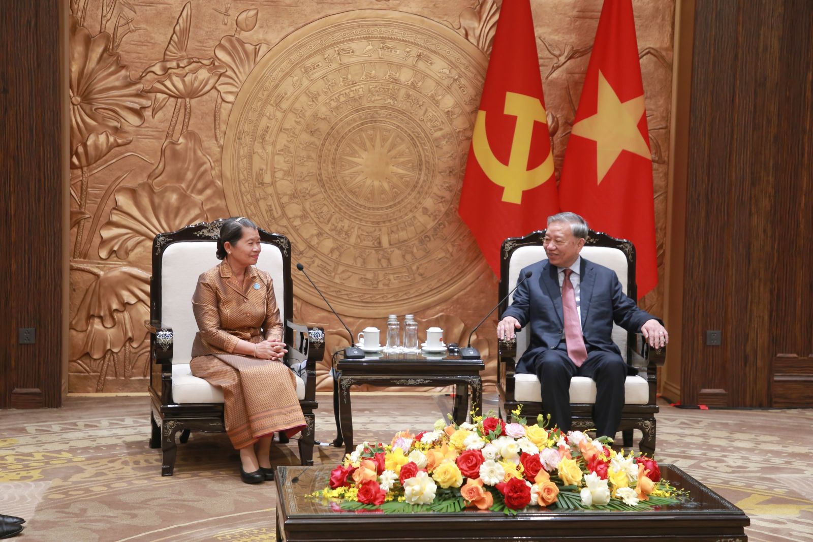 (ĐCSVN) - Chiều 23/3, tại Trụ sở Trung ương Đảng, Tổng Bí thư Ban Chấp hành Trung ương Đảng Cộng sản Việt Nam Tô Lâm đã tiếp bà Men Sam An (Men Sam On), Phó Chủ tịch Đảng Nhân dân Campuchia (CPP), Chủ tịch Hội đồng Quốc gia Mặt trận Đoàn kết Phát triển Tổ quốc Campuchia nhân dịp sang thăm làm việc tại Việt Nam theo lời mời của Chủ tịch Ủy ban Trung ương Mặt trận Tổ quốc Việt Nam.