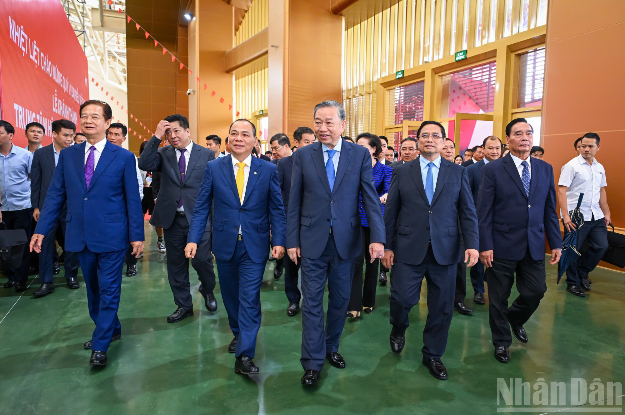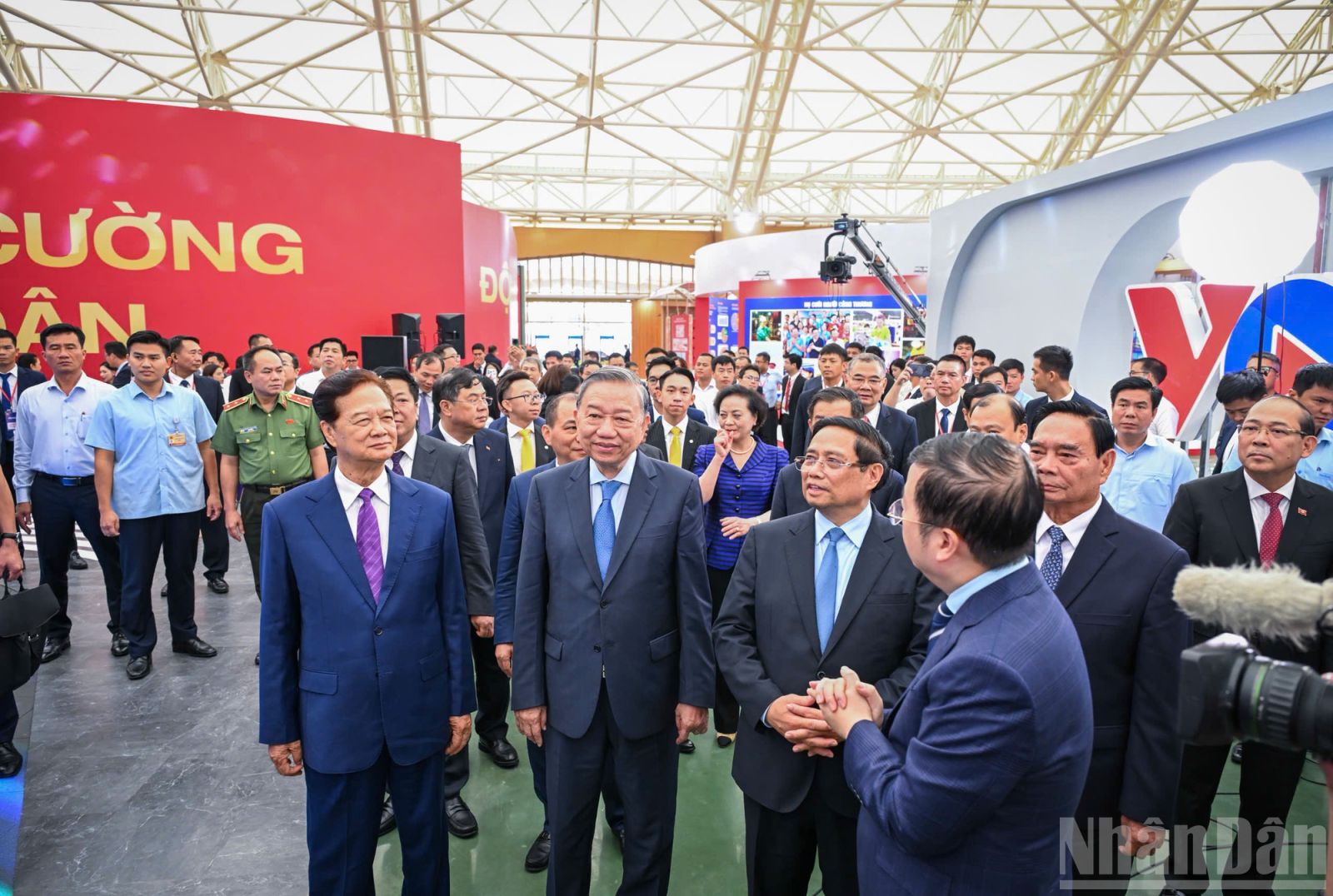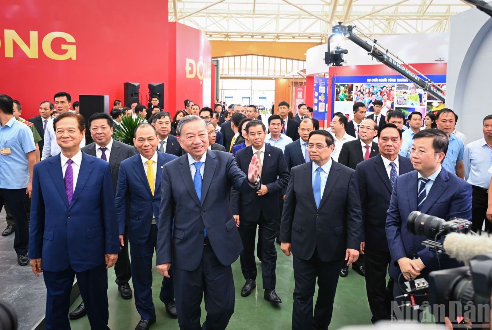 Sau khi thực hiện nghi thức cắt băng khánh thành, khởi công các công trình, dự án trọng điểm, Tổng Bí thư Tô Lâm, Thủ tướng Phạm Minh Chính cùng các đại biểu đã đi tham quan Trung tâm Hội chợ Triển lãm quốc gia.