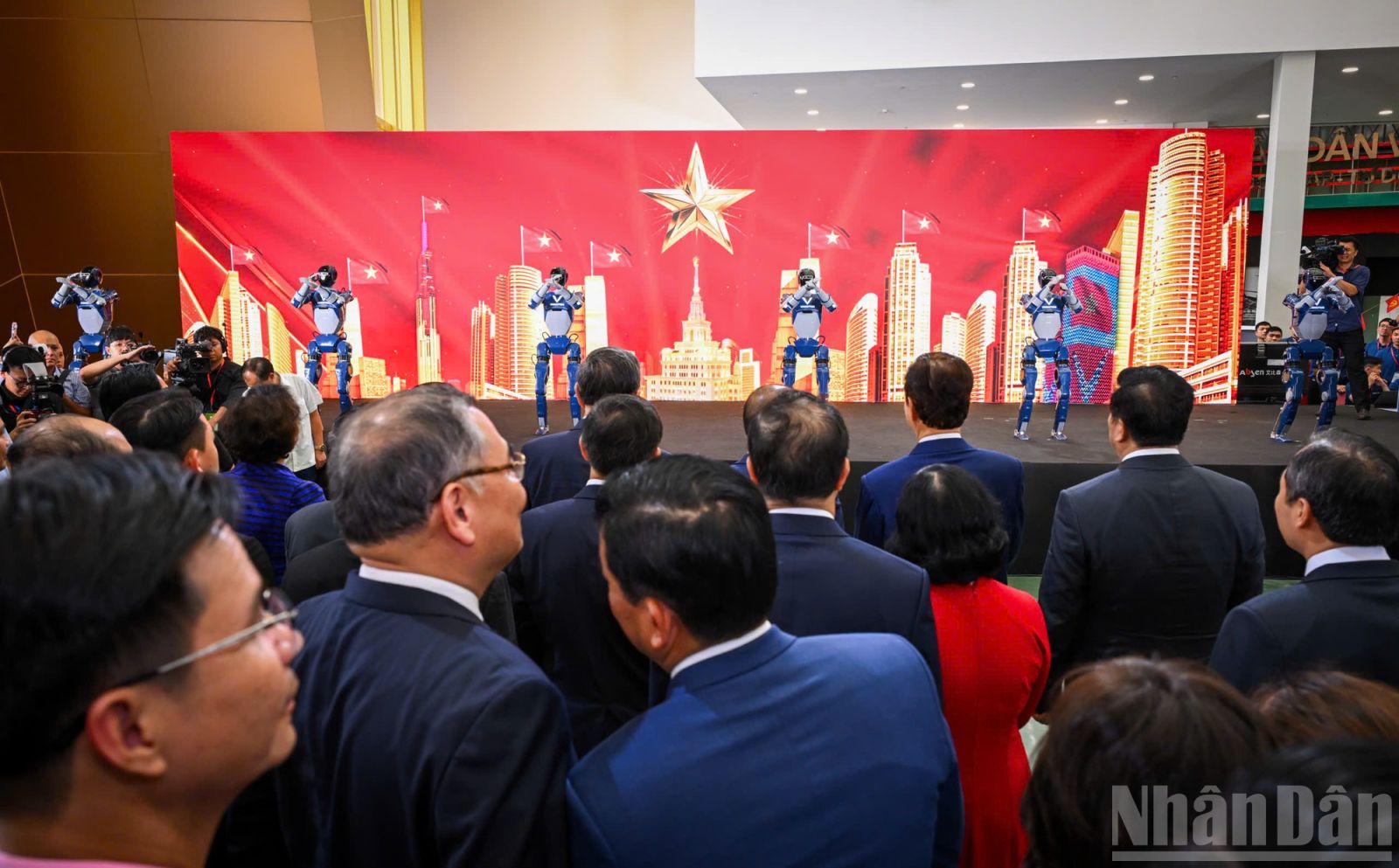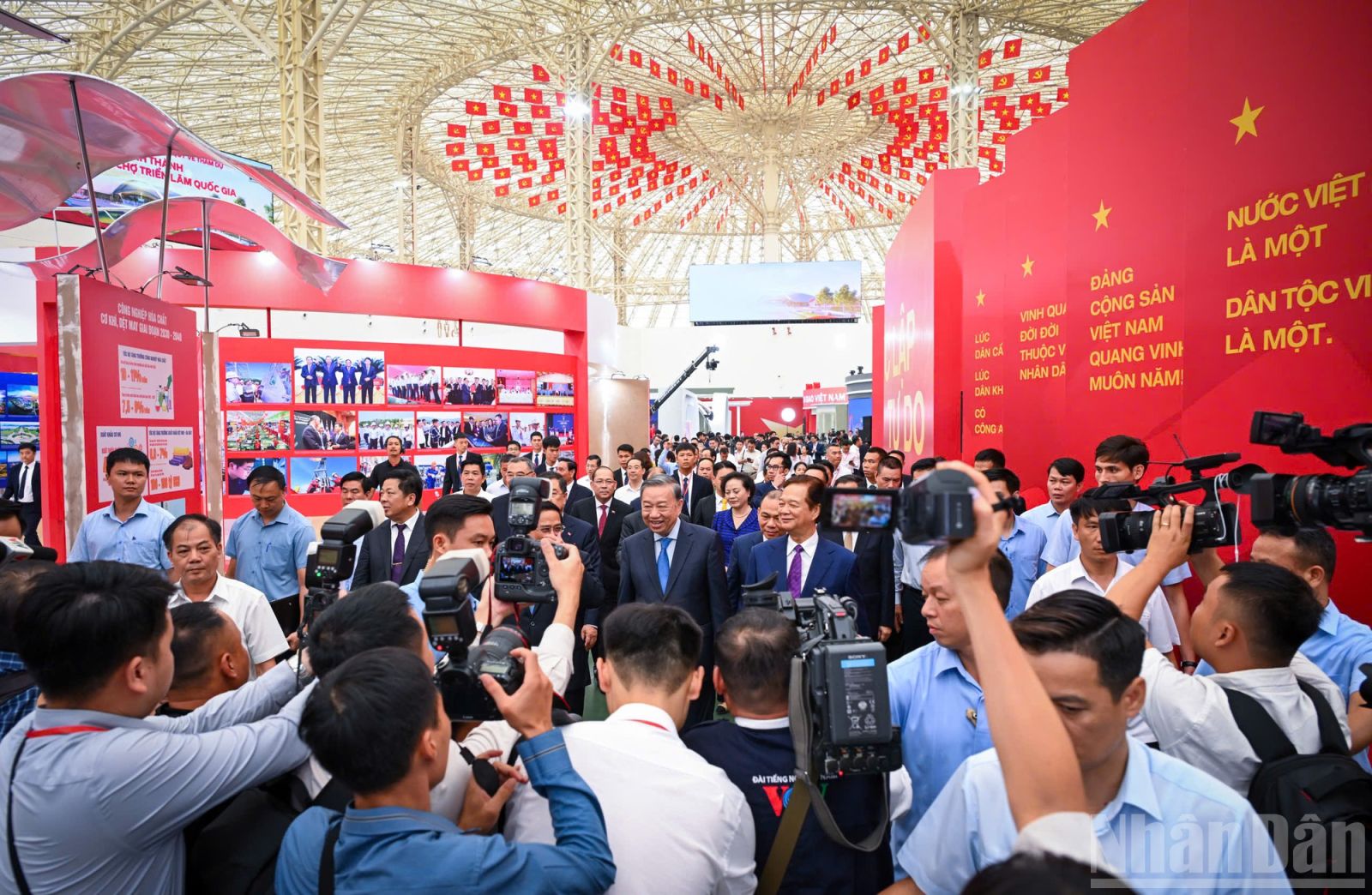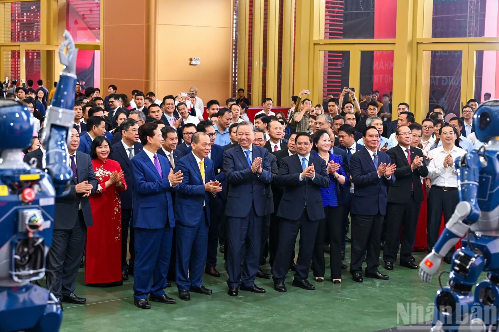 Sau khi thực hiện nghi thức cắt băng khánh thành, khởi công các công trình, dự án trọng điểm, Tổng Bí thư Tô Lâm, Thủ tướng Phạm Minh Chính cùng các đại biểu đã đi tham quan Trung tâm Hội chợ Triển lãm quốc gia.