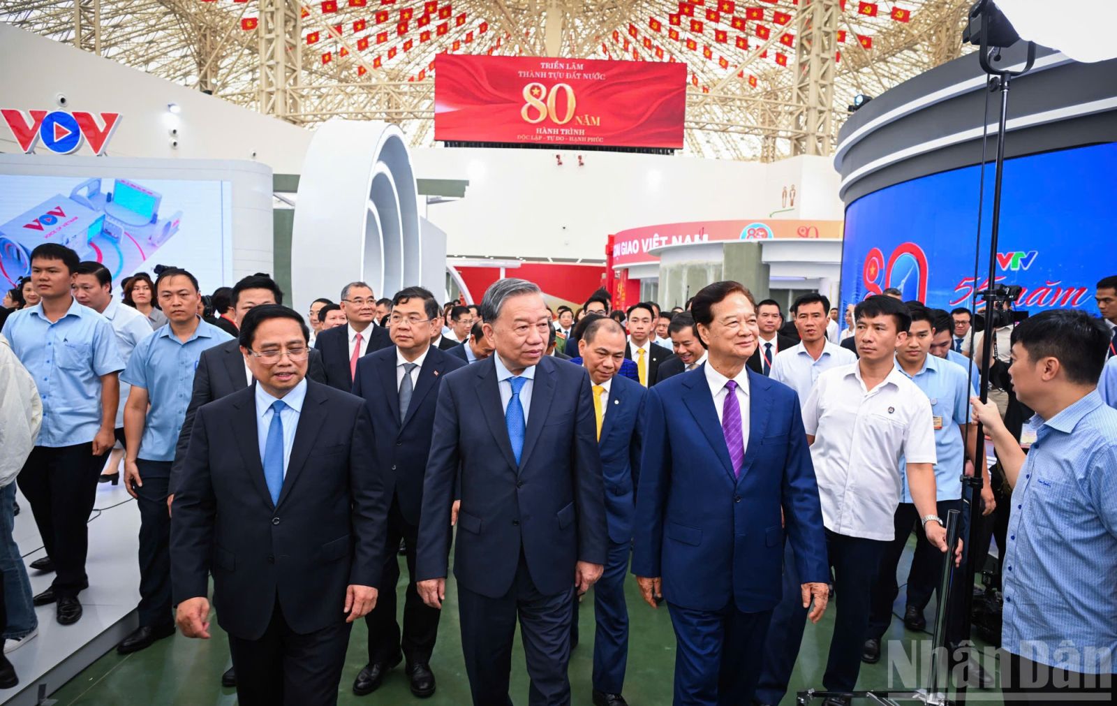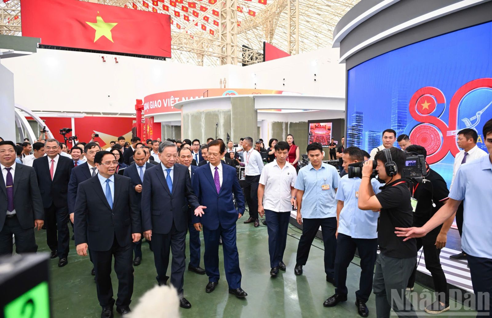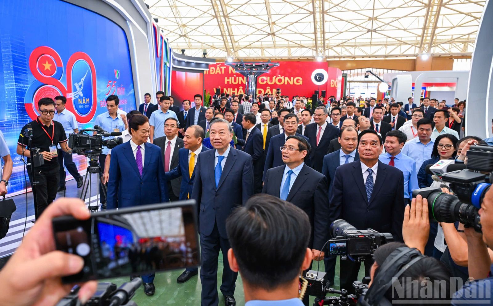 Sáng 19/8, sau khi thực hiện nghi thức cắt băng khánh thành, khởi công các công trình, dự án trọng điểm chào mừng 80 năm Ngày Quốc khánh tại điểm cầu Đông Anh, Hà Nội, Tổng Bí thư Tô Lâm và Thủ tướng Phạm Minh Chính đã đi tham quan Trung tâm Hội chợ Triển lãm Quốc gia.