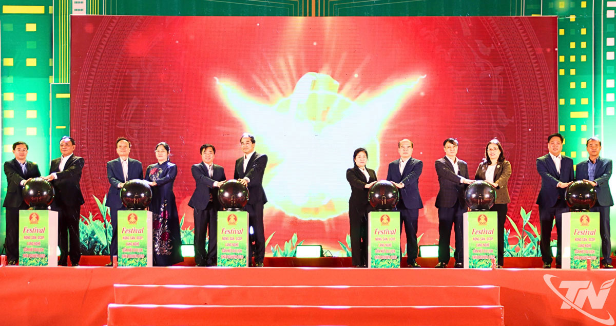 | Các đồng chí lãnh đạo tỉnh thực hiện nghi thức Khai mạc “Festival Nông sản, OCOP, làng nghề gắn kết du lịch - Thái Nguyên 2025” |