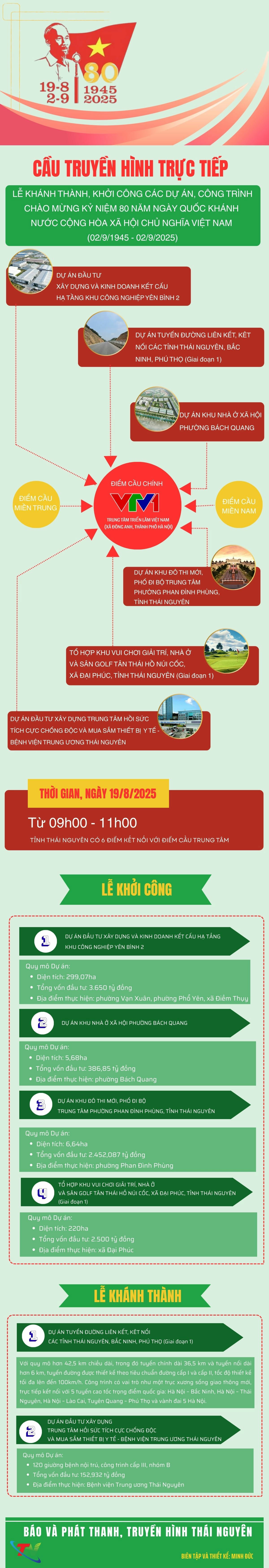 Thứ hai, 18/08/2025 | 17:07 A- A A+ | 6 điểm cầu tại Thái Nguyên trong Lễ khánh thành, khởi công các dự án, công trình chào mừng Quốc khánh TNĐT / baothainguyen.vn Từ khóa: điểm cầu Thái Nguyên khánh thành khởi công Quốc khánh Bình luận Email* Ý kiến của bạn* Nhập lại Gửi Các tin khác Kha Sơn xây dựng nông thôn mới nâng cao Khảo sát mức hỗ trợ thực hiện cuộc vận động 'Toàn dân đoàn kết xây dựng nông thôn mới, đô thị văn minh' Chuyển đổi xanh và số hóa là động lực then chốt cho tăng trưởng nhanh, bền vững Đồng chí Chủ tịch UBND tỉnh thăm Hợp tác xã chè Hảo Đạt Chủ tịch UBND tỉnh Thái Nguyên: Tập trung tháo gỡ vướng mắc, bảo đảm quyền lợi của người dân và doanh nghiệp Thái Nguyên hoàn tất công tác chuẩn bị khởi công, khánh thành các dự án trọng điểm