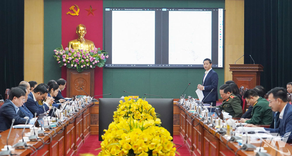 | Đồng chí Phó Chủ tịch UBND tỉnh Nguyễn Linh báo cáo công tác rà soát tổng thể các nội dung điều chỉnh Quy hoạch tỉnh Thái Nguyên. |