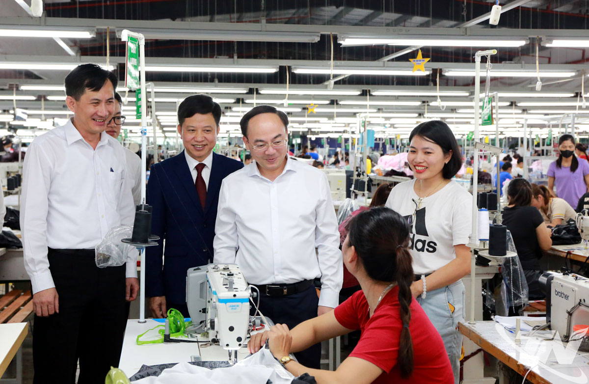 Đồng chí Nguyễn Đăng Bình thăm dây chuyền sản xuất của Nhà máy may TNG Đồng Hỷ.