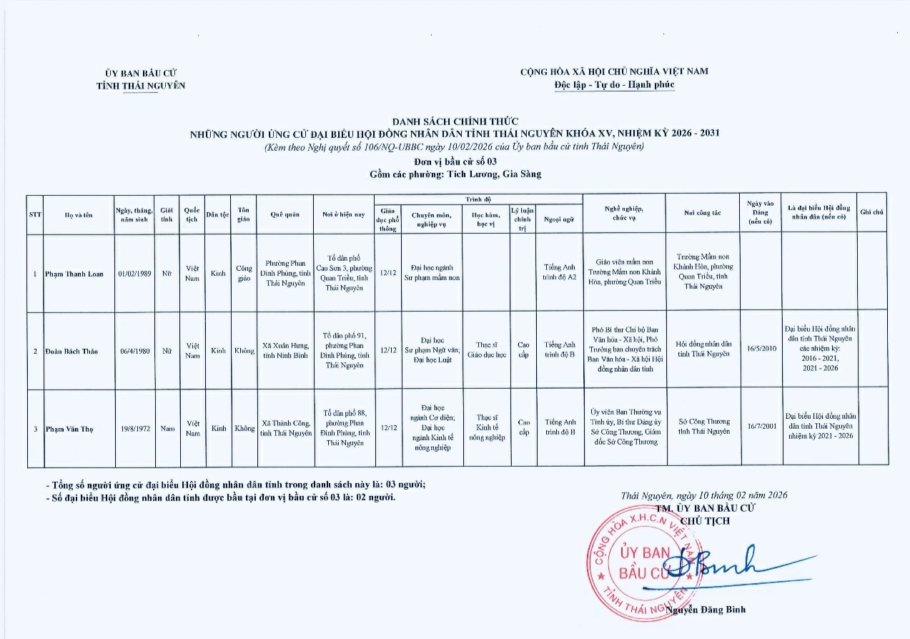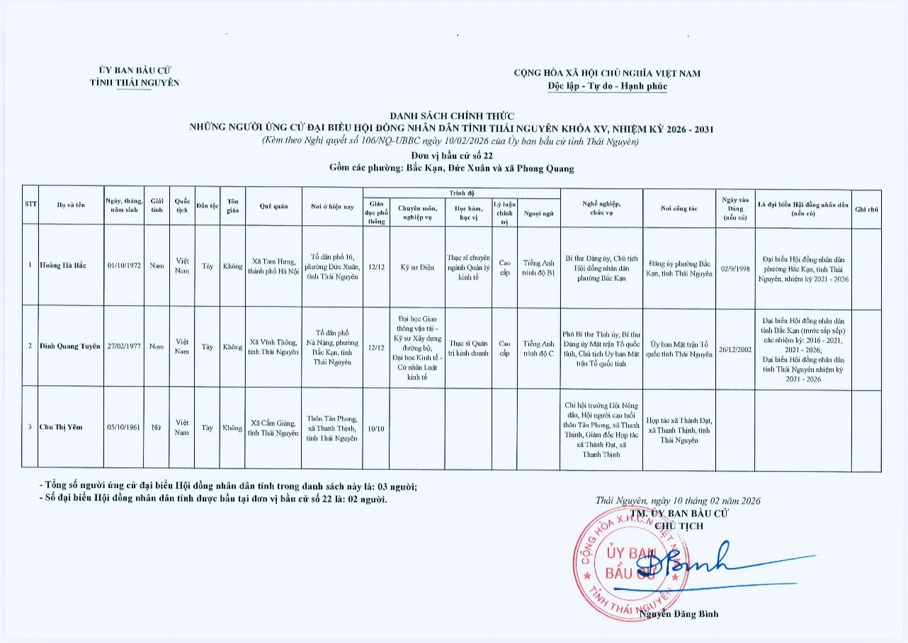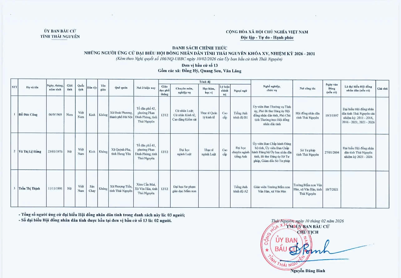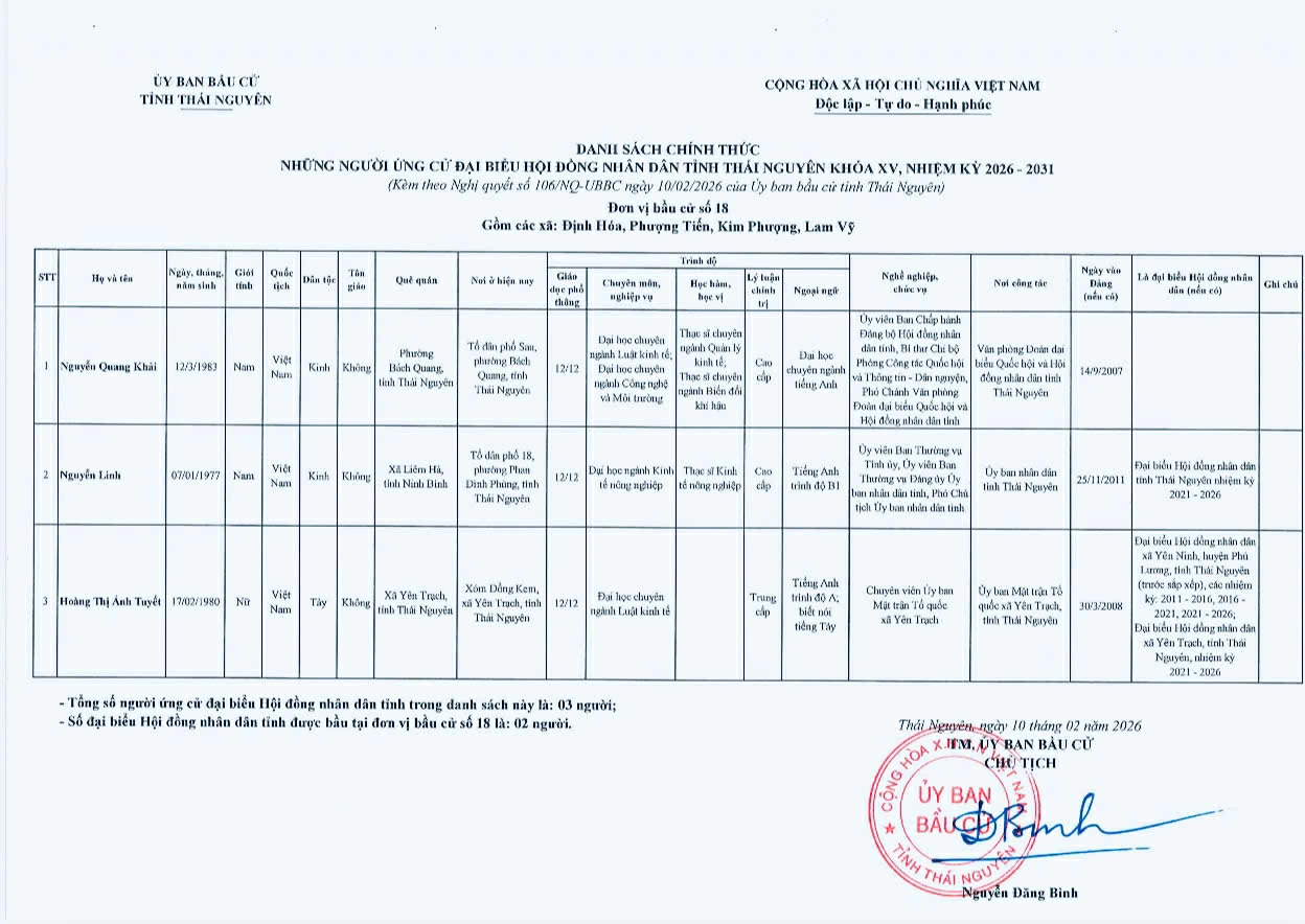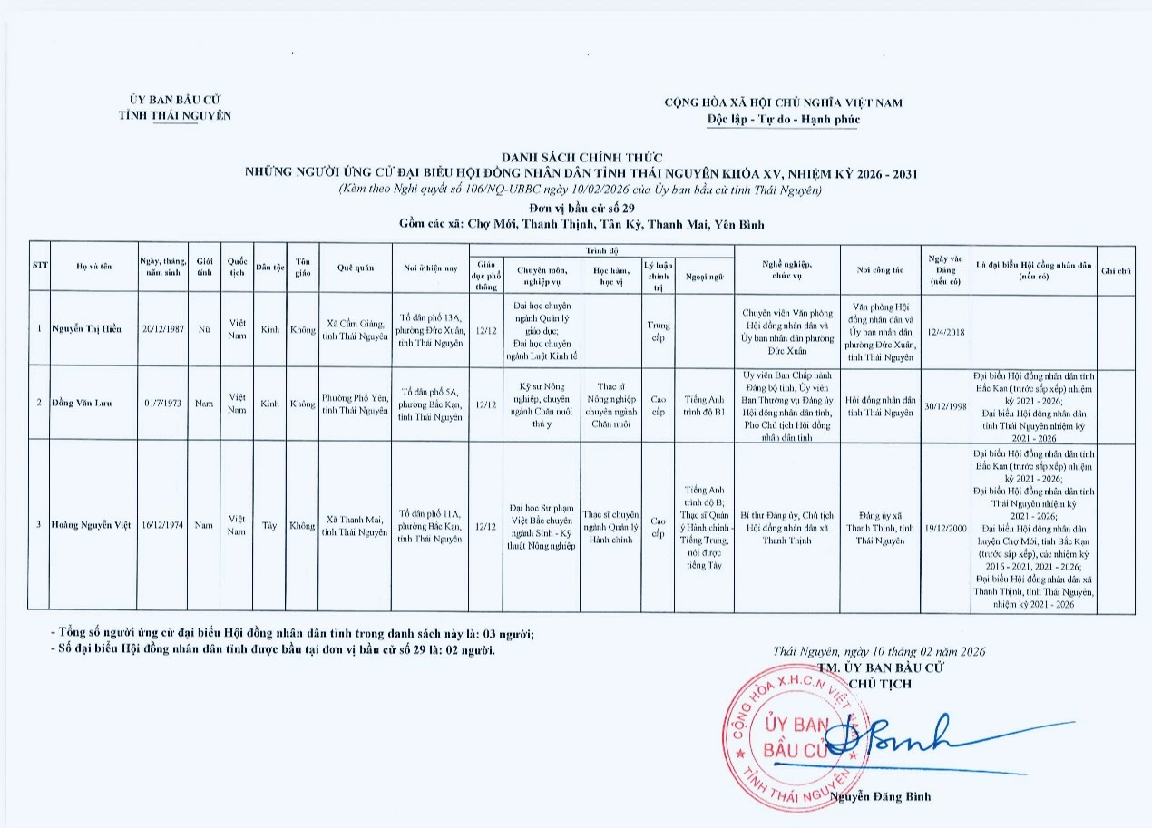 Ủy ban bầu cử tỉnh Thái Nguyên vừa ban hành Nghị quyết công bố danh sách 91 người ứng cử đại biểu HĐND tỉnh khóa XV, nhiệm kỳ 2026-2031, theo 29 đơn vị bầu cử, để bầu 60 đại biểu HĐND tỉnh.