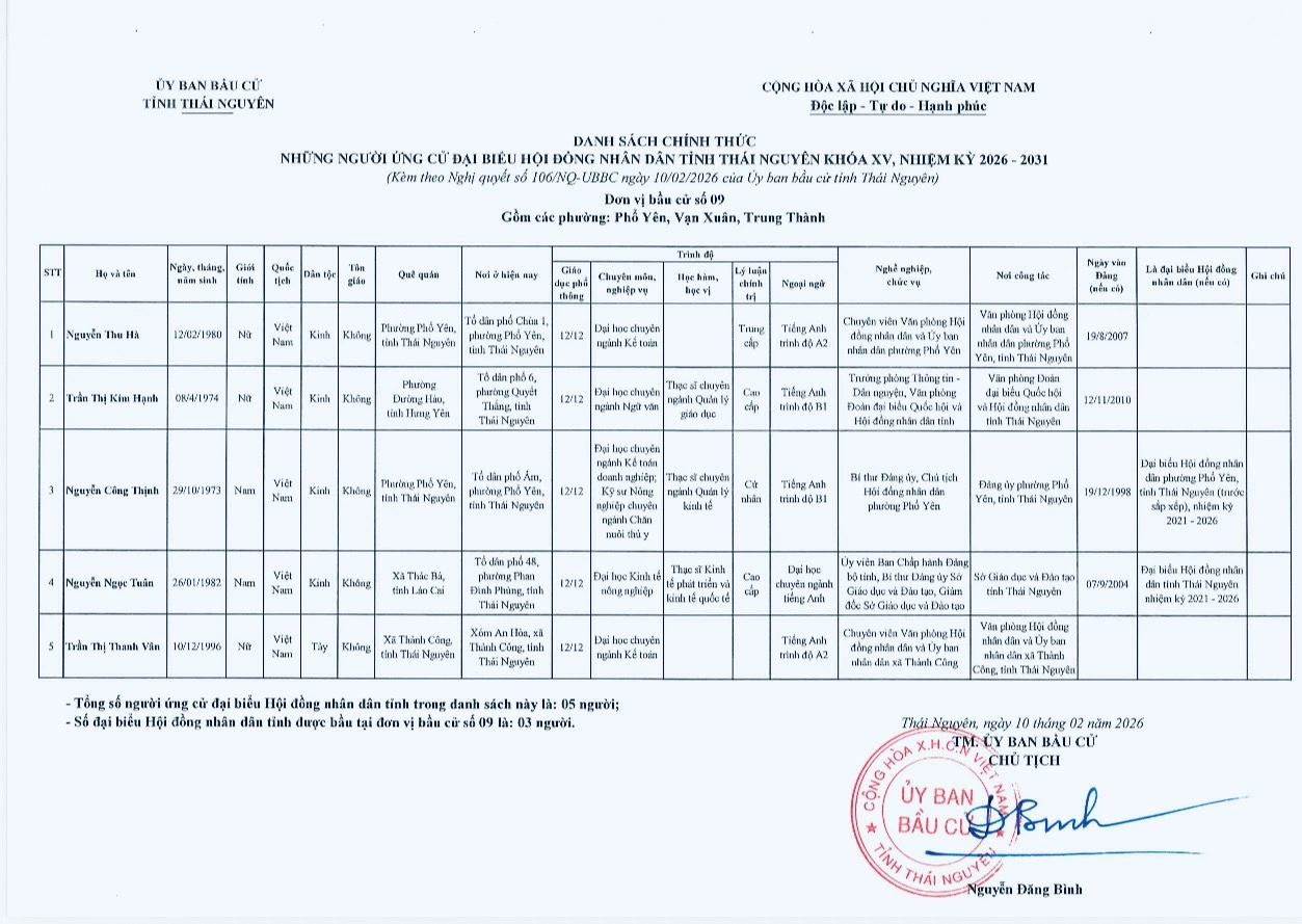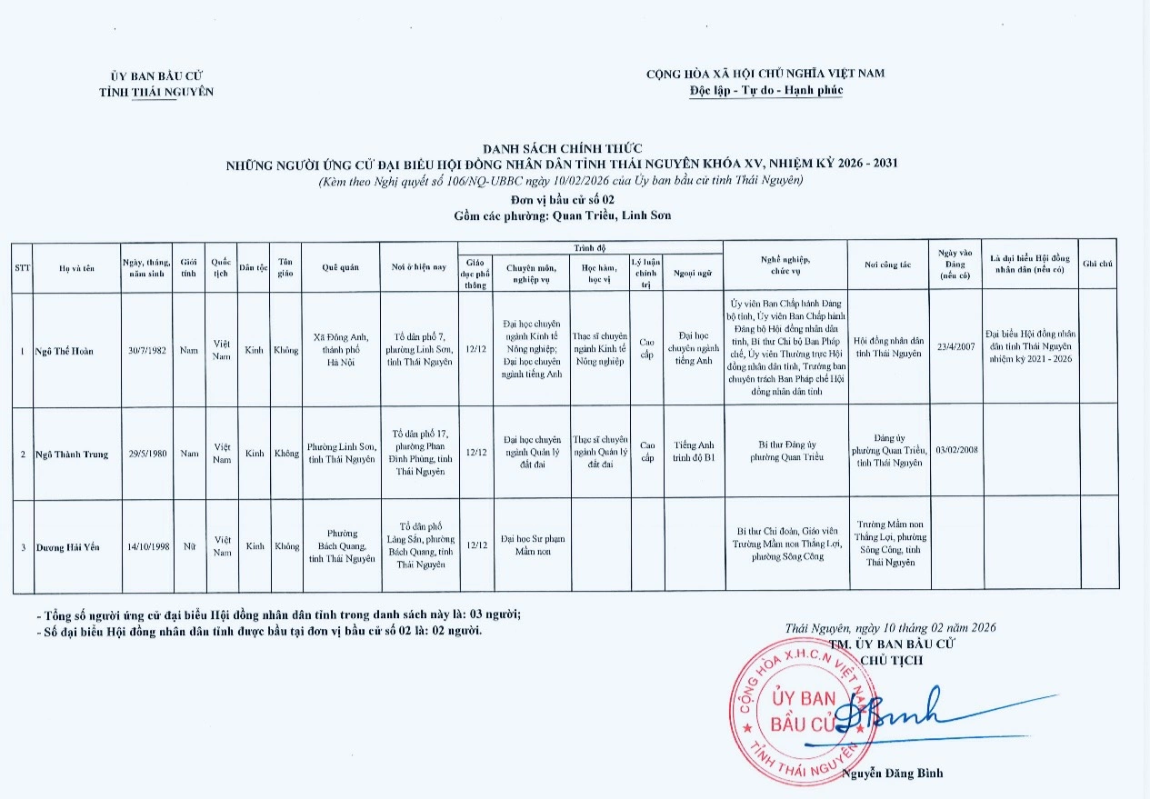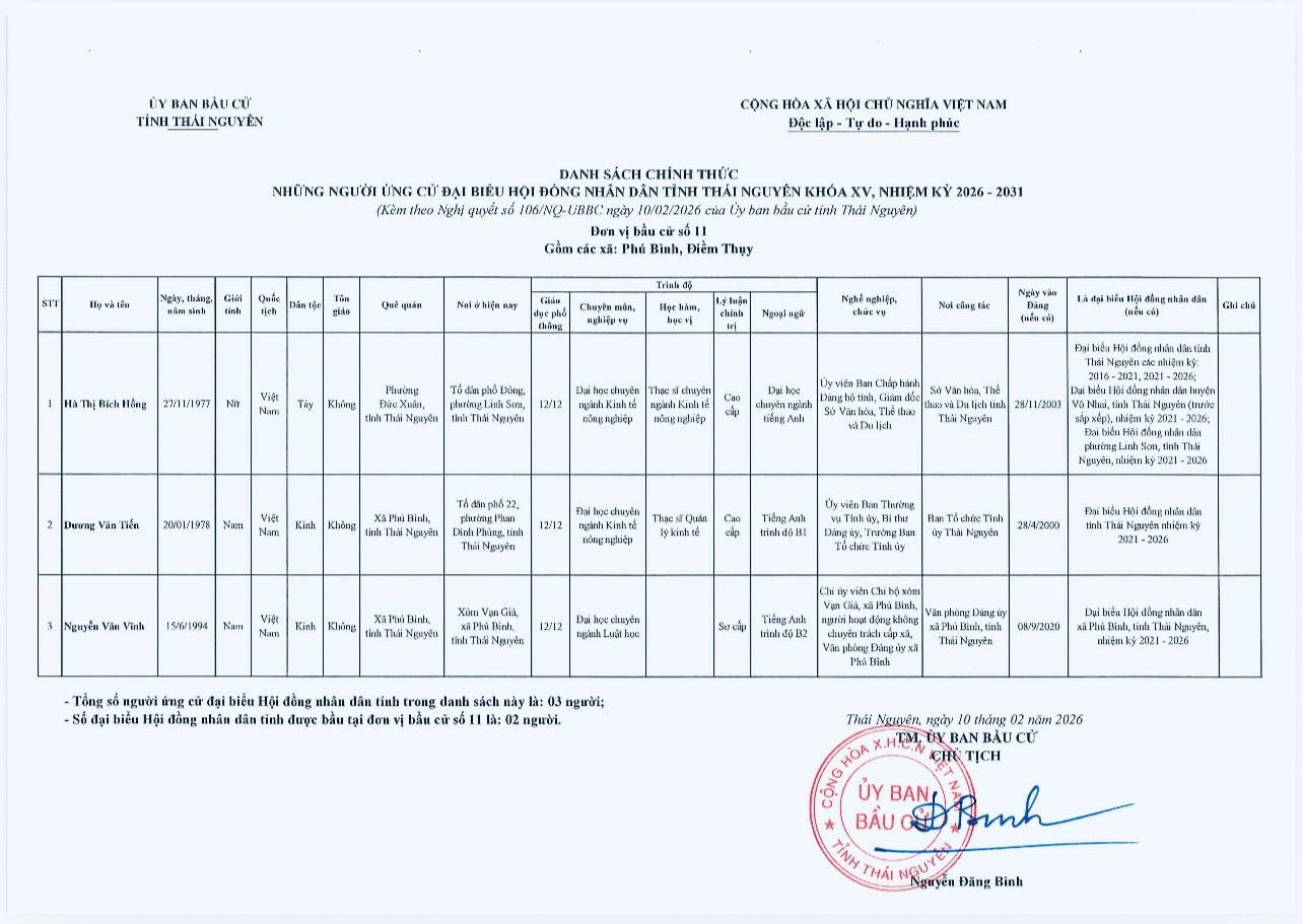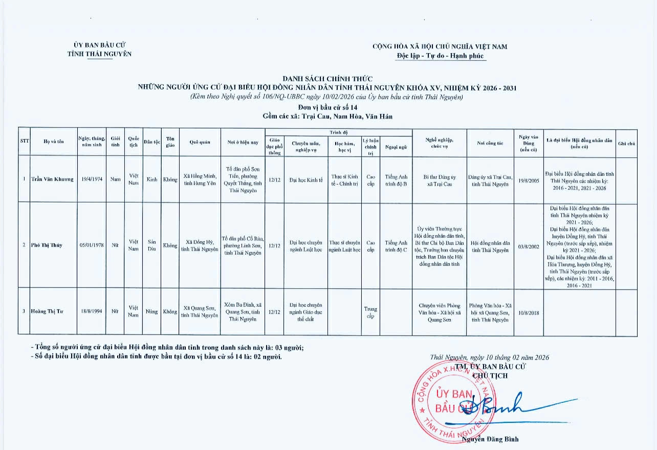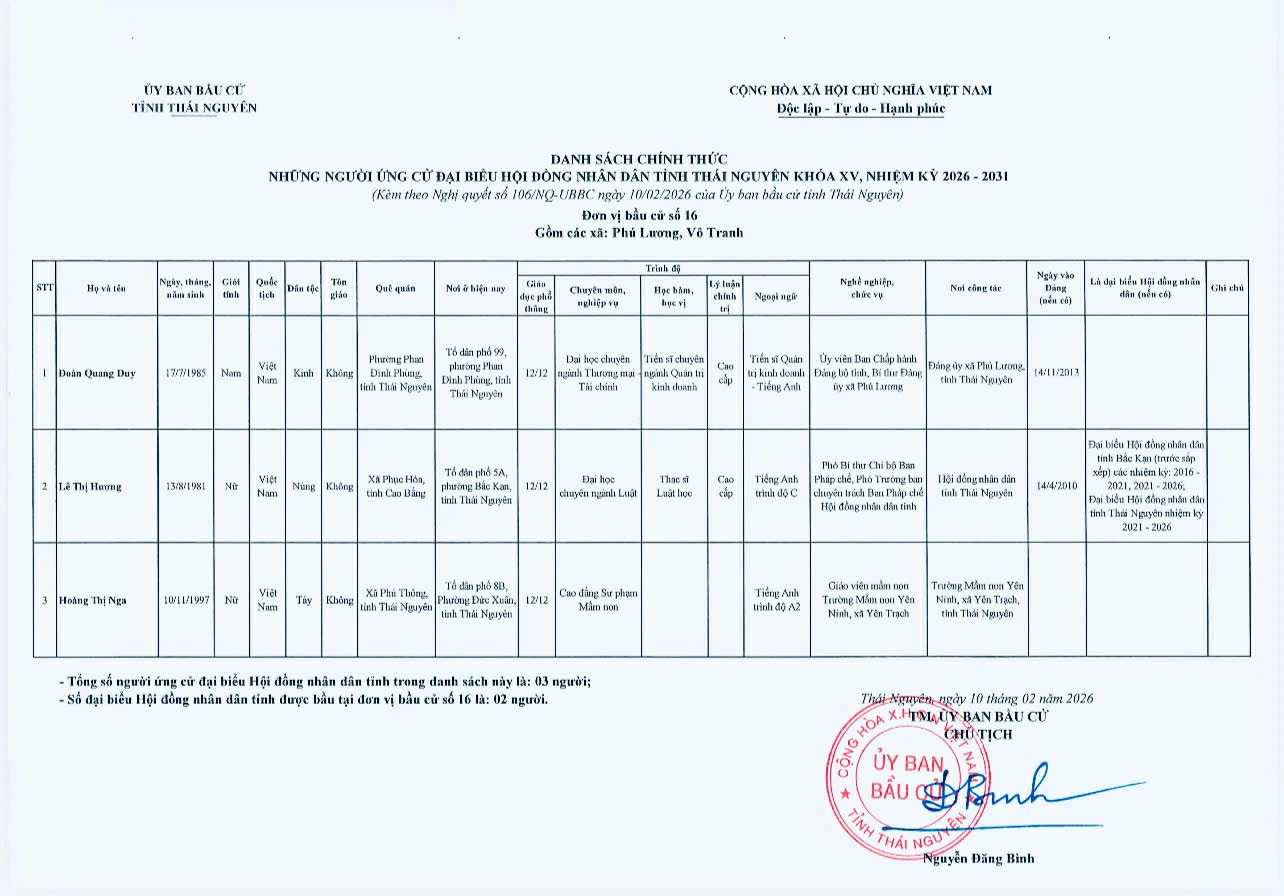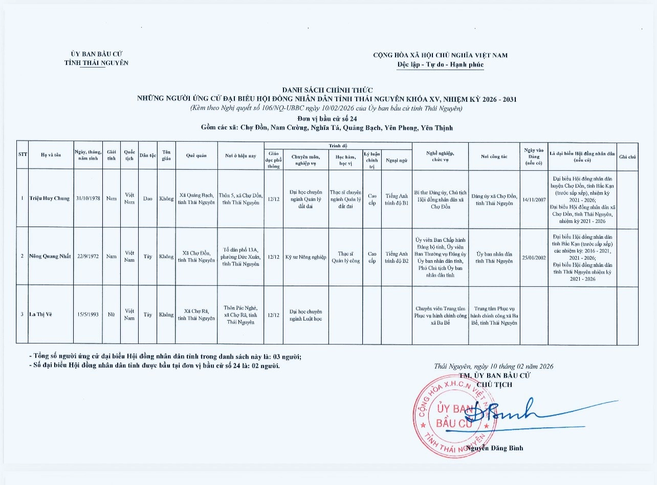Ủy ban bầu cử tỉnh Thái Nguyên vừa ban hành Nghị quyết công bố danh sách 91 người ứng cử đại biểu HĐND tỉnh khóa XV, nhiệm kỳ 2026-2031, theo 29 đơn vị bầu cử, để bầu 60 đại biểu HĐND tỉnh.