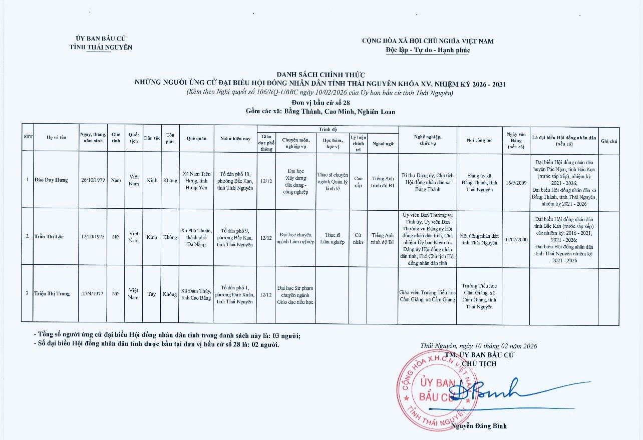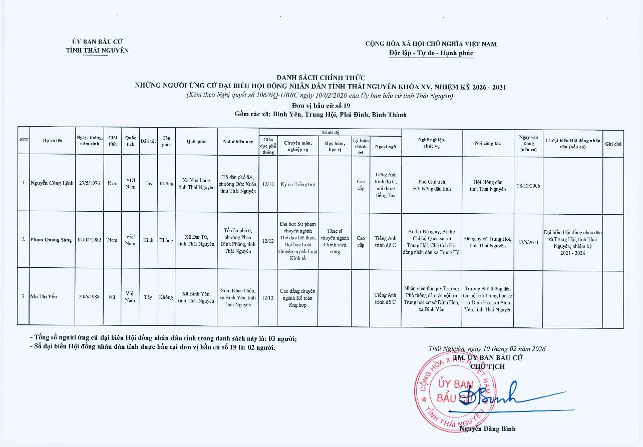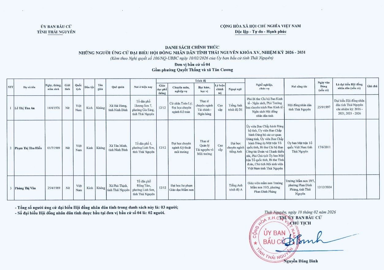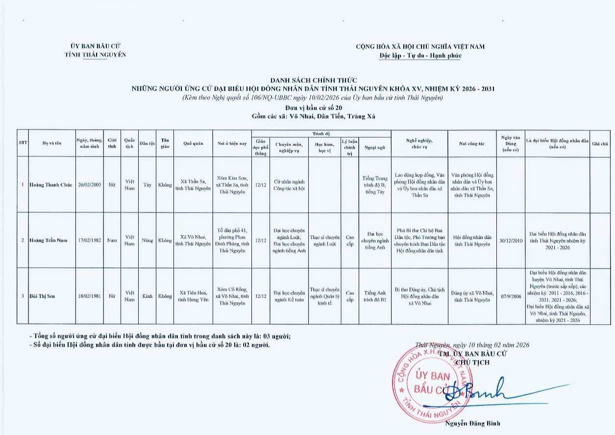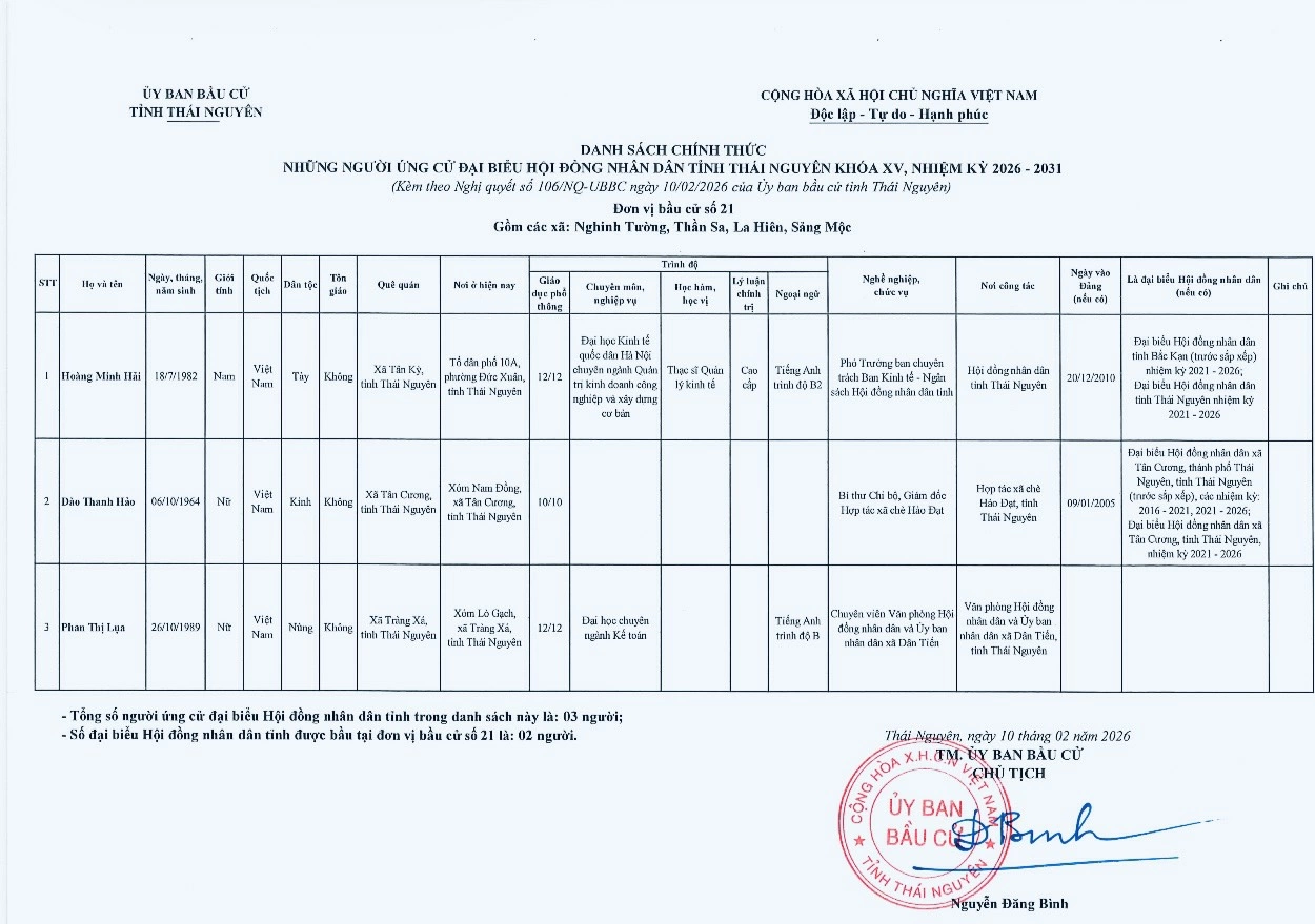 Ủy ban bầu cử tỉnh Thái Nguyên vừa ban hành Nghị quyết công bố danh sách 91 người ứng cử đại biểu HĐND tỉnh khóa XV, nhiệm kỳ 2026-2031, theo 29 đơn vị bầu cử, để bầu 60 đại biểu HĐND tỉnh.