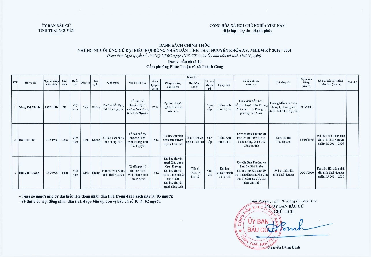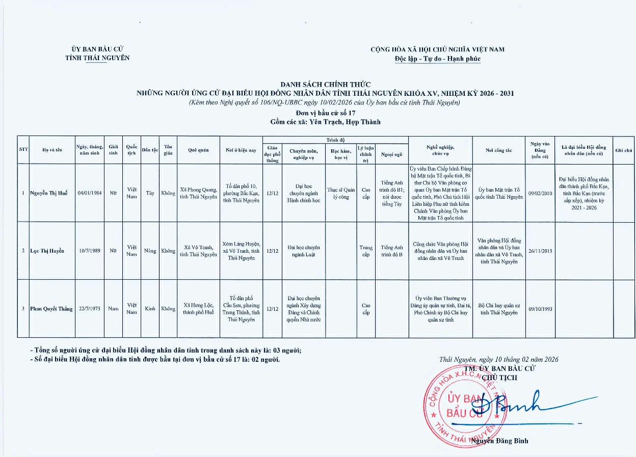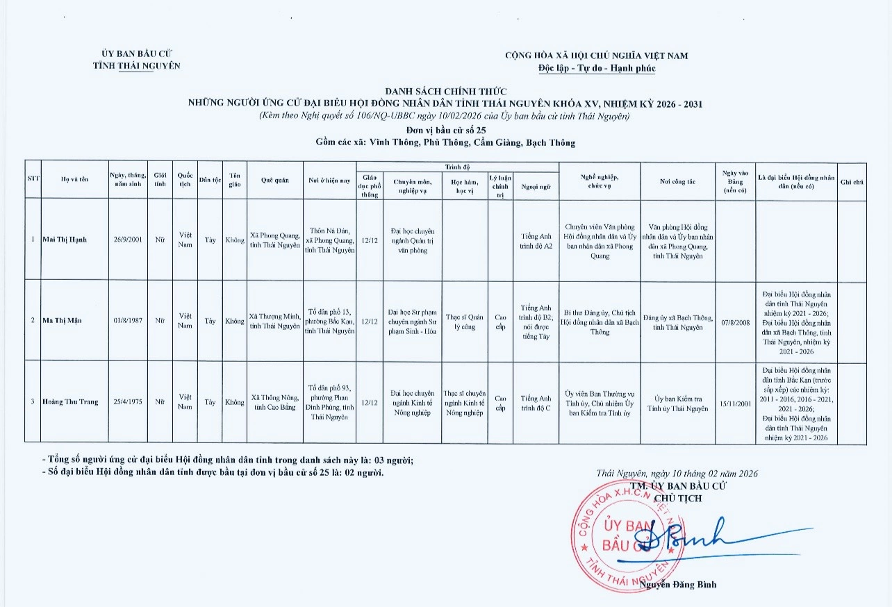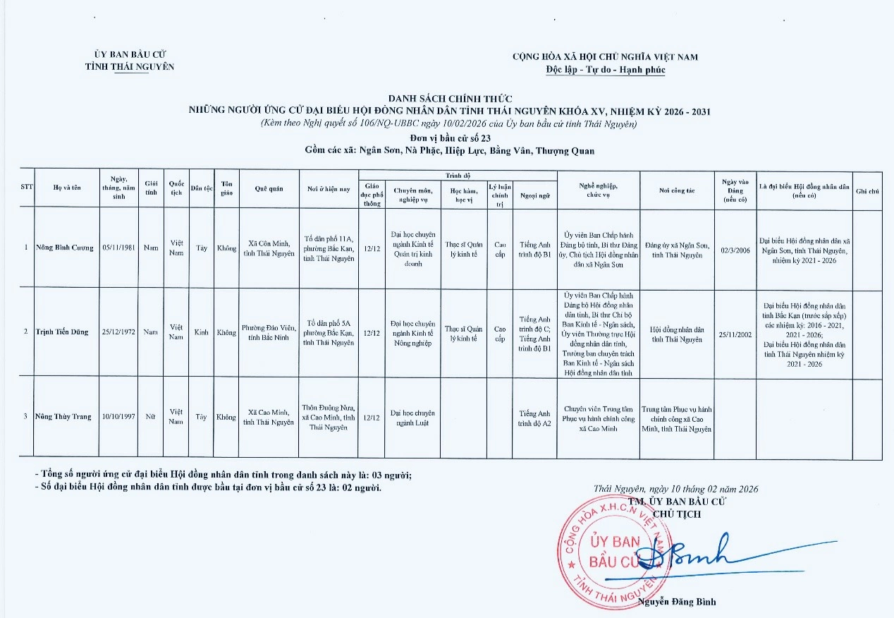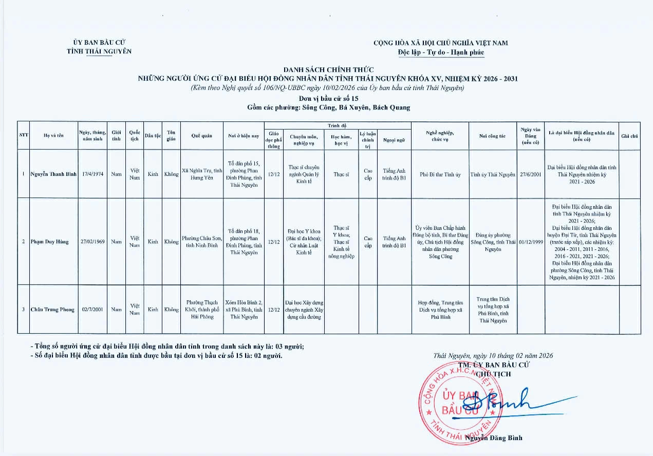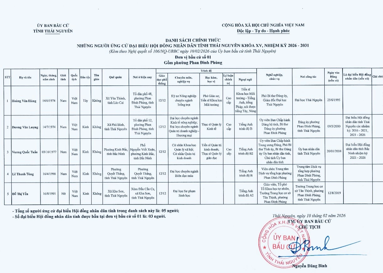 Ủy ban bầu cử tỉnh Thái Nguyên vừa ban hành Nghị quyết công bố danh sách 91 người ứng cử đại biểu HĐND tỉnh khóa XV, nhiệm kỳ 2026-2031, theo 29 đơn vị bầu cử, để bầu 60 đại biểu HĐND tỉnh.
