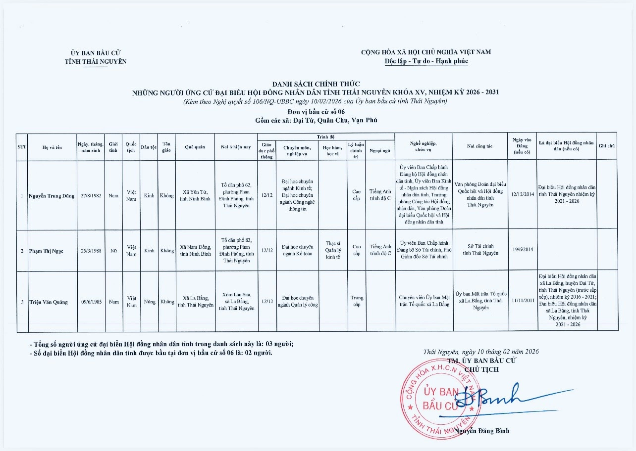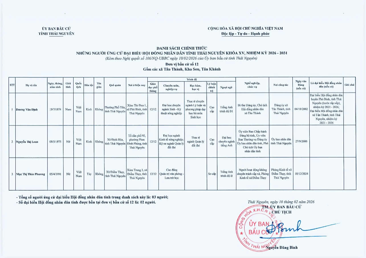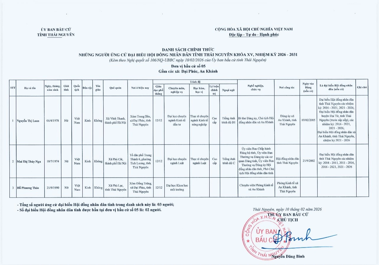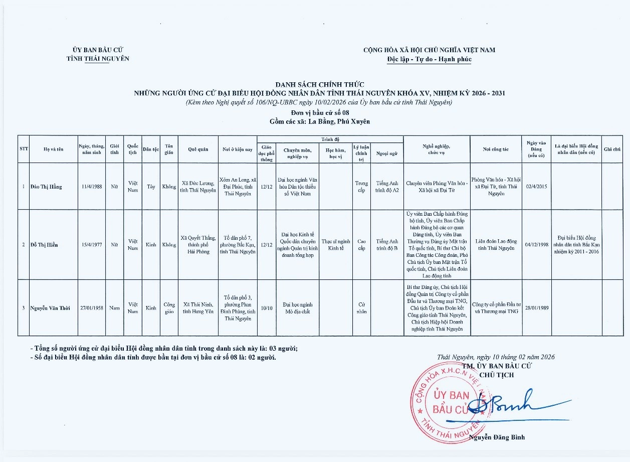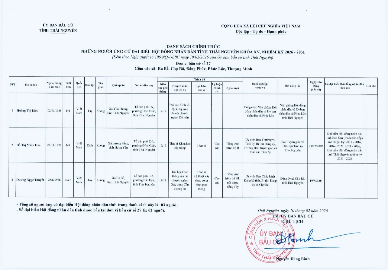 Ủy ban bầu cử tỉnh Thái Nguyên vừa ban hành Nghị quyết công bố danh sách 91 người ứng cử đại biểu HĐND tỉnh khóa XV, nhiệm kỳ 2026-2031, theo 29 đơn vị bầu cử, để bầu 60 đại biểu HĐND tỉnh.
