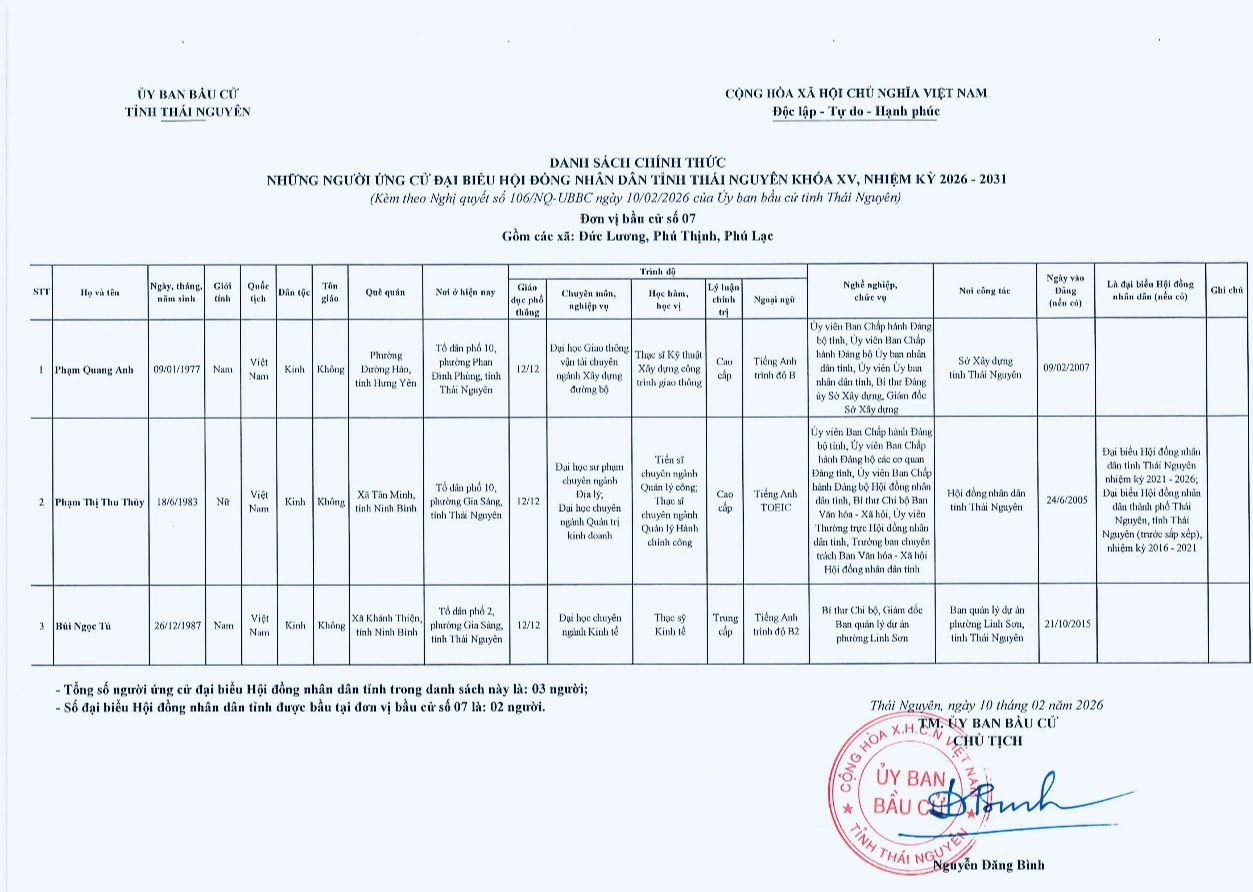 Danh sách người ứng cử đại biểu HĐND tỉnh Thái Nguyên khóa XV