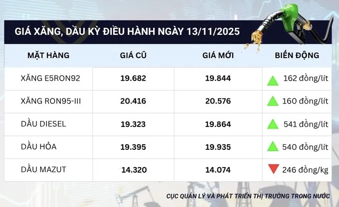 Theo đó, kỳ điều chỉnh này, xăng sinh học E5RON92 tăng 162 đồng mỗi lít, lên mức 19.844 đồng/lít; xăng khoáng RON95-III tăng 160 đồng/lít, lên 20.576 đồng/lít; dầu diesel 0.05S tăng 541 đồng/lít, lên 19.864 đồng/lít; dầu hỏa tăng 540 đồng/lít, lên 19.935 đồng/lít; dầu mazut 180CST 3.5S giảm 246 đồng/kg, còn 14.074 đồng/kg.