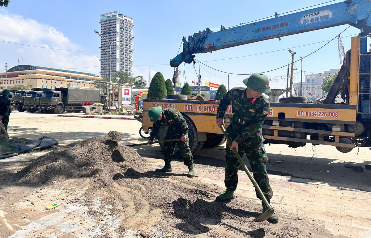 Lực lượng cán bộ, chiến sĩ có mặt tại quảng trường Võ Nguyên Giáp, thuộc phường Phan Đình Phùng để tiến hành dọn bùn đất, thu gom rác thải, khơi thông cống rãnh và làm sạch môi trường.