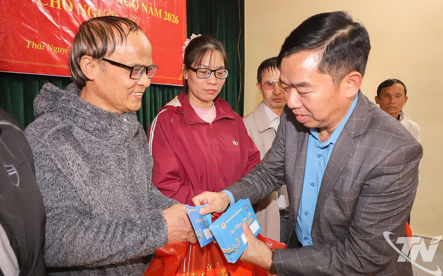 | Đại diện Liên đoàn Lao động tỉnh trao quà Tết cho hội viên Hội Người mù tỉnh Thái Nguyên. |