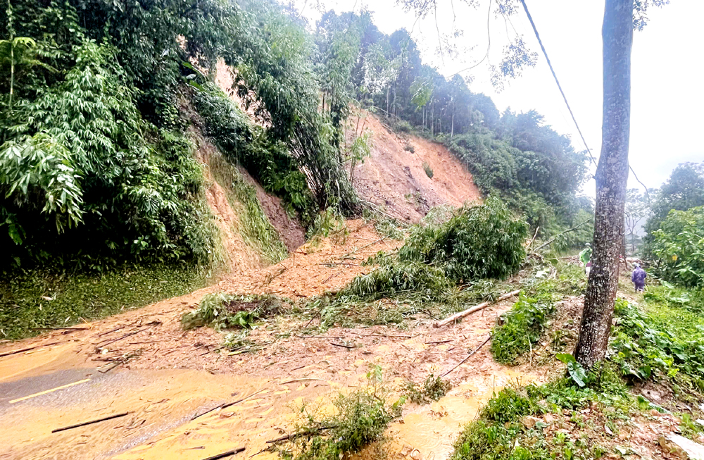 | Đường tỉnh 258B đoạn giáp ranh giữa xã Nghiên Loan và xã Bằng Thành bị sạt lở chiều 7-10, gây ách tắc giao thông cục bộ. |