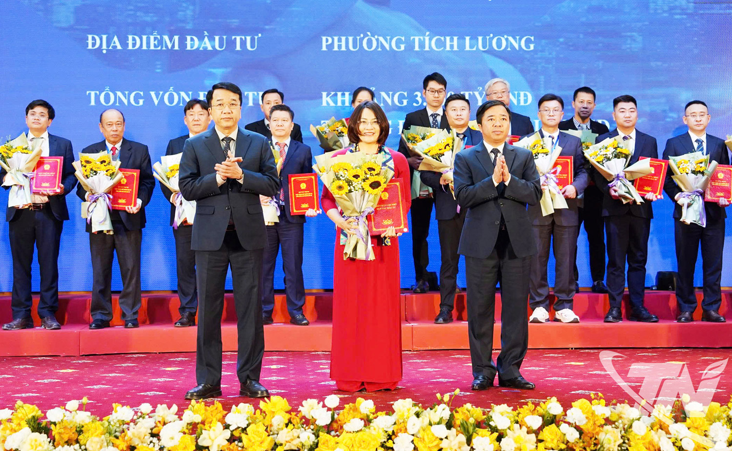 | Các đồng chí lãnh đạo tỉnh trao quyết định phê duyệt chủ trương đầu tư, giấy chứng nhận đăng ký đầu tư và biên bản ghi nhớ đầu tư cho các nhà đầu tư tại Hội nghị xúc tiến đầu tư tỉnh Thái Nguyên năm 2026. |