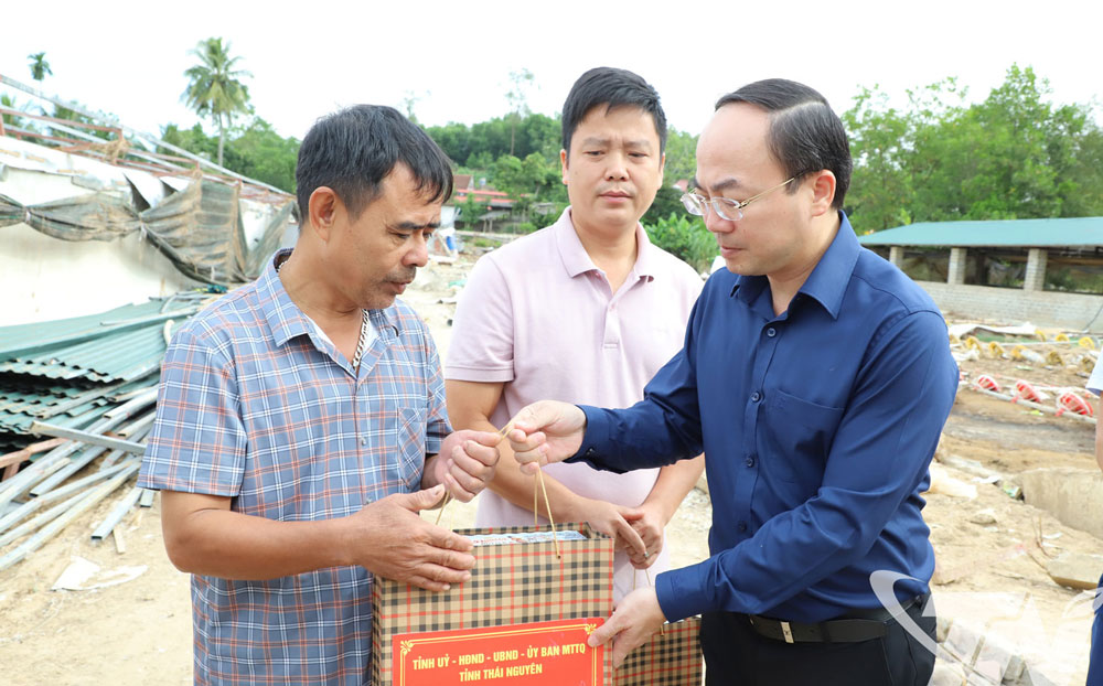 | Đồng chí Nguyễn Đăng Bình tặng quà, động viên các hộ bị thiệt hại tại xóm Núi Chùa, xã Tân Thành. |