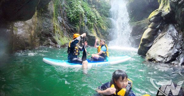 | Du khách trải nghiệm tại thác Động Tiên. |