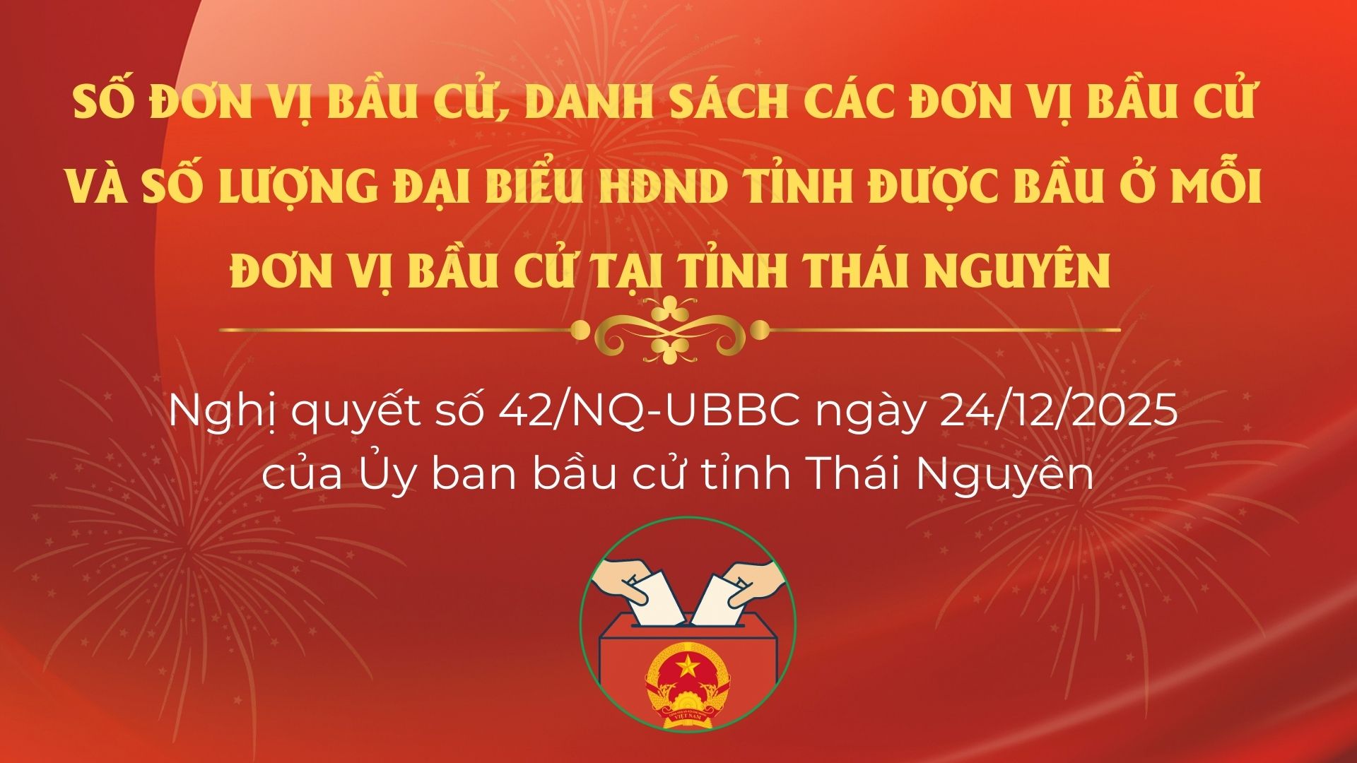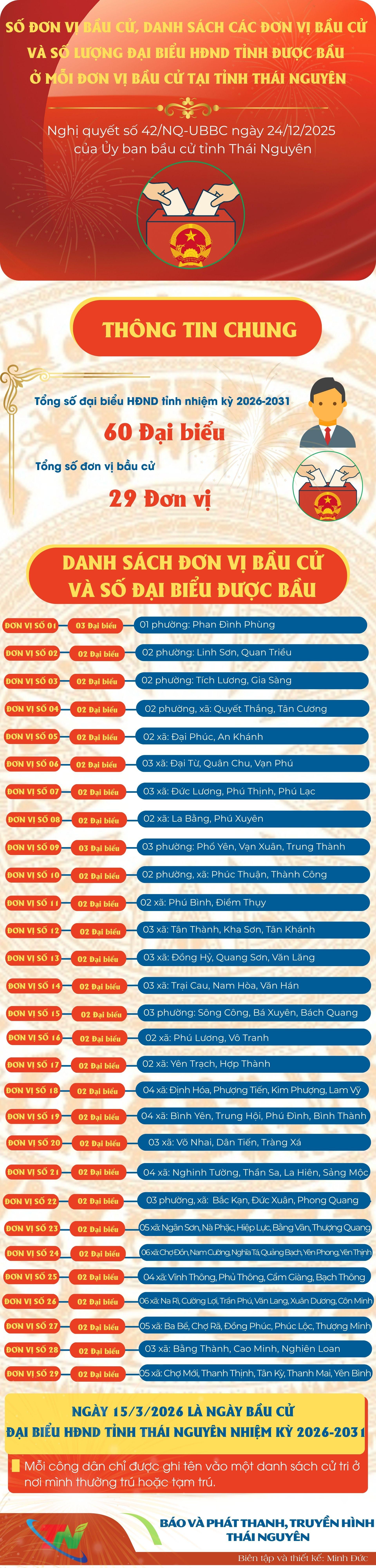 Theo Nghị quyết số 42/NQ-UBBC ngày 24/12/2025 của Ủy ban Bầu cử tỉnh Thái Nguyên, toàn tỉnh có 29 đơn vị bầu cử, với tổng số 60 đại biểu HĐND tỉnh được bầu trong nhiệm kỳ 2026-2031. Cụ thể, mỗi đơn vị bầu cử được phân bổ từ 2 đến 3 đại biểu, tùy theo quy mô dân số và đặc điểm địa bàn. Dưới đây là chi tiết các đơn vị bầu cử và số lượng đại biểu được bầu tại từng đơn vị trên địa bàn tỉnh.