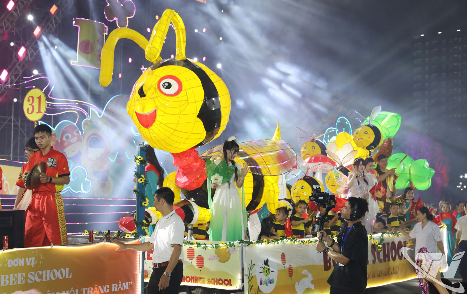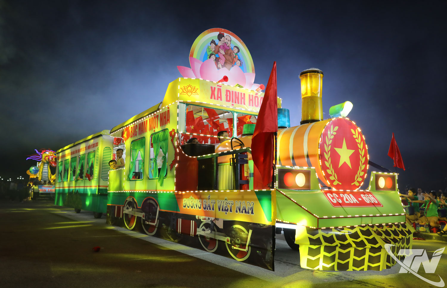 Điểm nhấn đặc sắc của Đêm hội là màn diễn diễu các mô hình đèn Trung thu. 11 mô hình xuất sắc đạt giải cấp tỉnh cùng hội tụ, tạo nên bức tranh lung linh, sáng tạo.