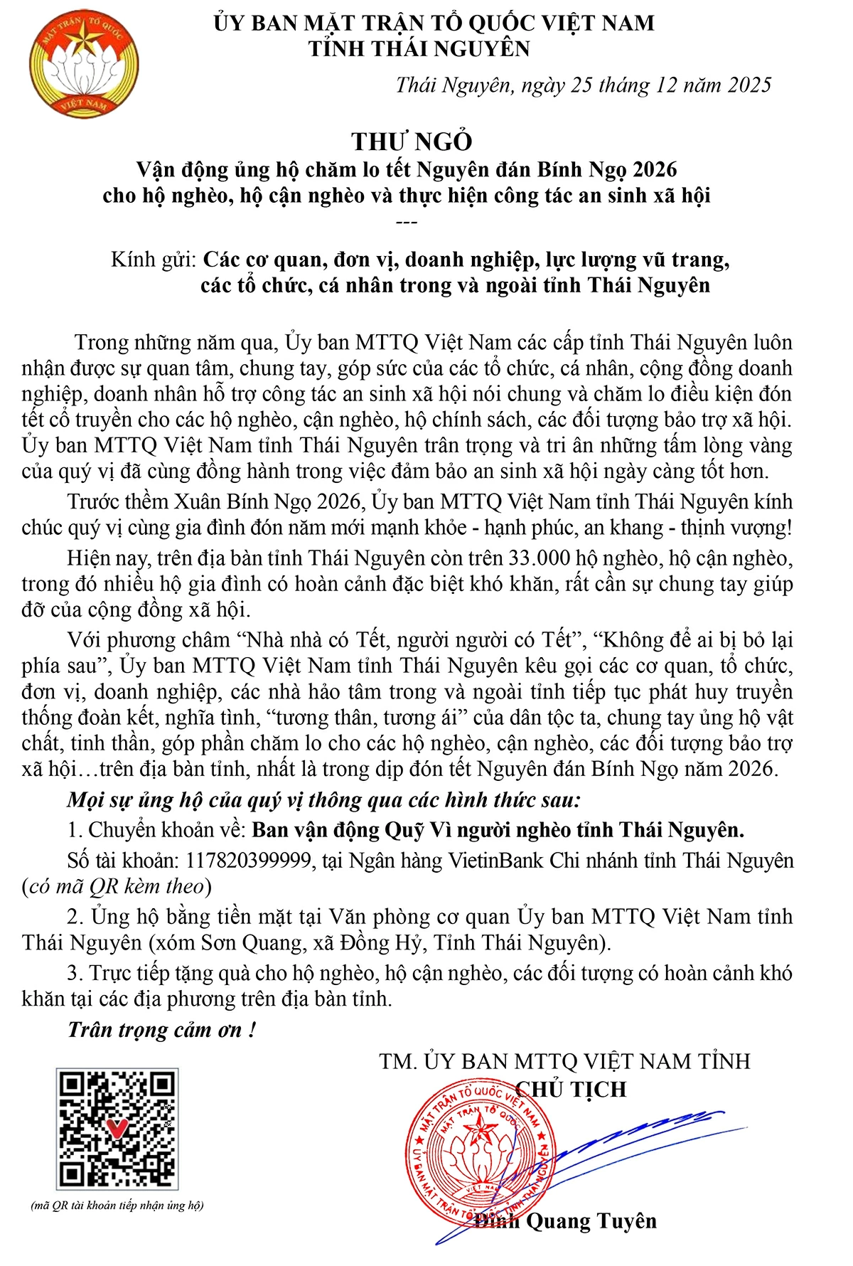 | Hình thức đăng ký ủng hộ, tiếp nhận và thực hiện hỗ trợ * Hình thức đăng ký ủng hộ: Đăng ký bằng phiếu (theo mẫu gửi kèm) gửi về Ban Chỉ đạo cấp tỉnh trước ngày 15/01/2026 (qua Ủy ban MTTQ Việt Nam tỉnh - Cơ quan Thường trực Ban Chỉ đạo Tuần cao điểm Tết vì người nghèo tỉnh). * (Đầu mối liên hệ: Ban Tuyên giáo, công tác xã hội, cơ quan Ủy ban MTTQ tỉnh: Đ/c Hoàng Hải Hà, Phó Chủ tịch Hội LHPN tỉnh, Trưởng ban, SĐT: 0968.195.668; đồng chí Lê Huy Thăng, Phó Trưởng Ban; SĐT: 0989.804.666; đồng chí Lưu Thị Thoan, Chuyên viên, SĐT: 0915.202.299) Tiếp nhận: Các tập thể, cá nhân, doanh nghiệp đăng ký và hỗ trợ trực tiếp tại các địa phương hoặc chuyển kinh phí hỗ trợ qua Quỹ “Vì người nghèo” tỉnh bằng các hình thức: * Ủng hộ qua tài khoản: - Tên tài khoản: Ban vận động Quỹ "Vì người nghèo" tỉnh Thái Nguyên. + Số tài khoản: 117820399999, tại Ngân hàng VietinBank - Chi nhánh tỉnh Thái Nguyên. + Số tài khoản: 3761.0.3033761.91046 Tại: KBNN Khu vực VII - Phòng Kế toán Nhà nước (2261). * Ủng hộ bằng tiền mặt: Trực tiếp tại Văn phòng cơ quan Ủy ban MTTQ Việt Nam tỉnh Thái Nguyên (xóm Sơn Quang, xã Đồng Hỷ, tỉnh Thái Nguyên) |