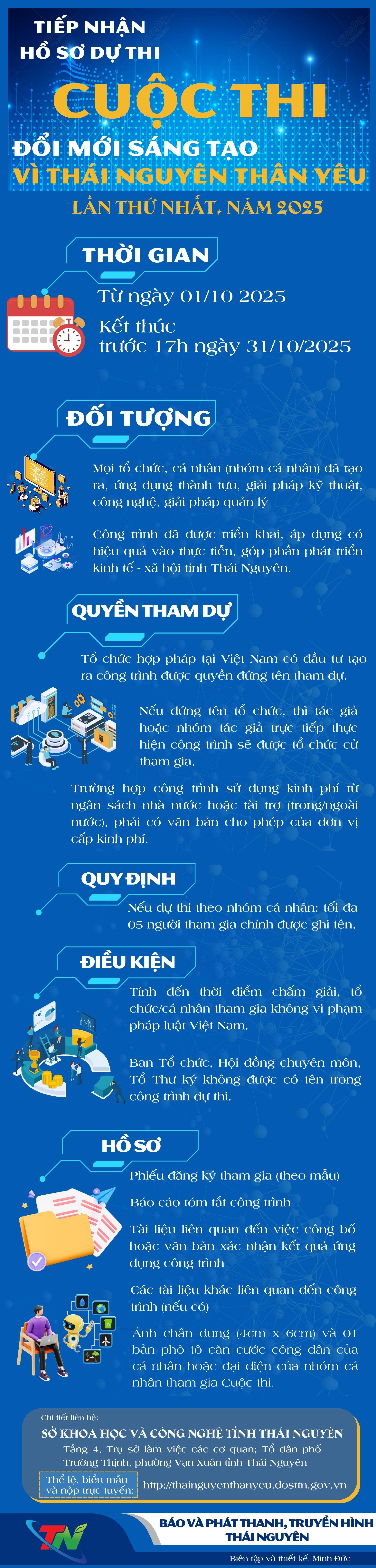 Thứ năm, 02/10/2025 | 18:42 A- A A+ | Tiếp nhận hồ sơ Cuộc thi 'Đổi mới sáng tạo – Vì Thái Nguyên thân yêu' lần thứ nhất TNĐT / baothainguyen.vn Từ khóa: tiếp nhận hồ sơ đổi mới sáng tạo Thái Nguyên Bình luận Email* Ý kiến của bạn* Nhập lại Gửi Các tin khác MTTQ khẳng định vai trò, vị thế trong xây dựng khối đại đoàn kết toàn dân tộc Thu hoạch cá ruộng vùng cao Diễn đàn Quốc gia phát triển kinh tế số và xã hội số: Định hình chiến lược cho giai đoạn mới Đẩy mạnh thu hút đầu tư vào cụm công nghiệp Vươn lên nhờ nguồn vốn ưu đãi Tiêu thụ nông sản gắn với làm du lịch