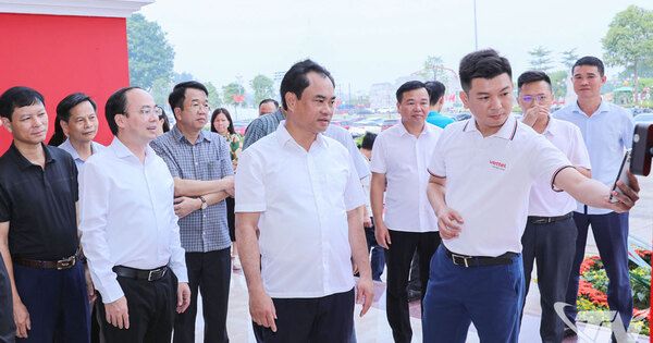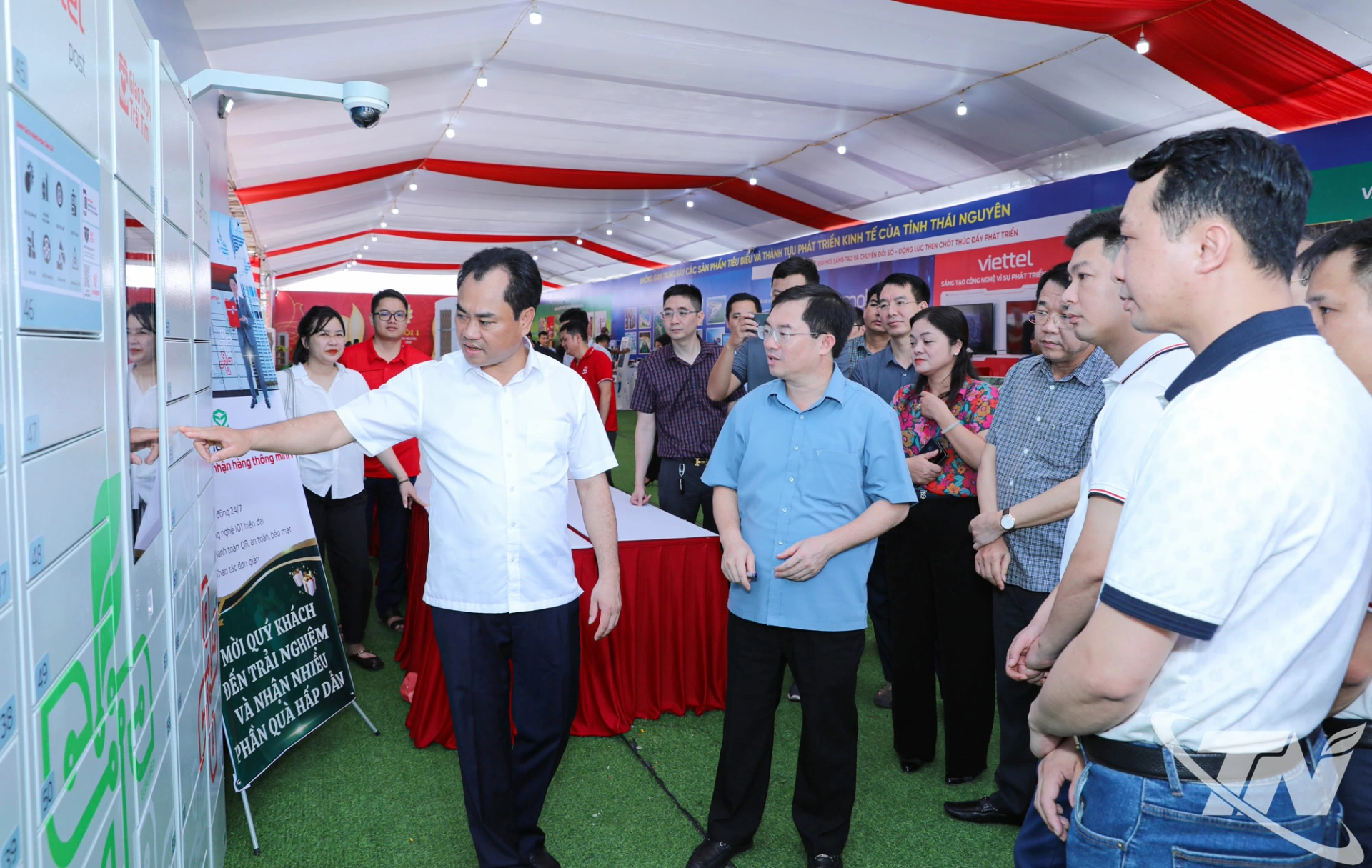 | Đồng chí Bí thư Tỉnh ủy Trịnh Việt Hùng kiểm tra không gian trưng bày các sản phẩm tiêu biểu và thành tựu kinh tế của tỉnh Thái Nguyên. |
