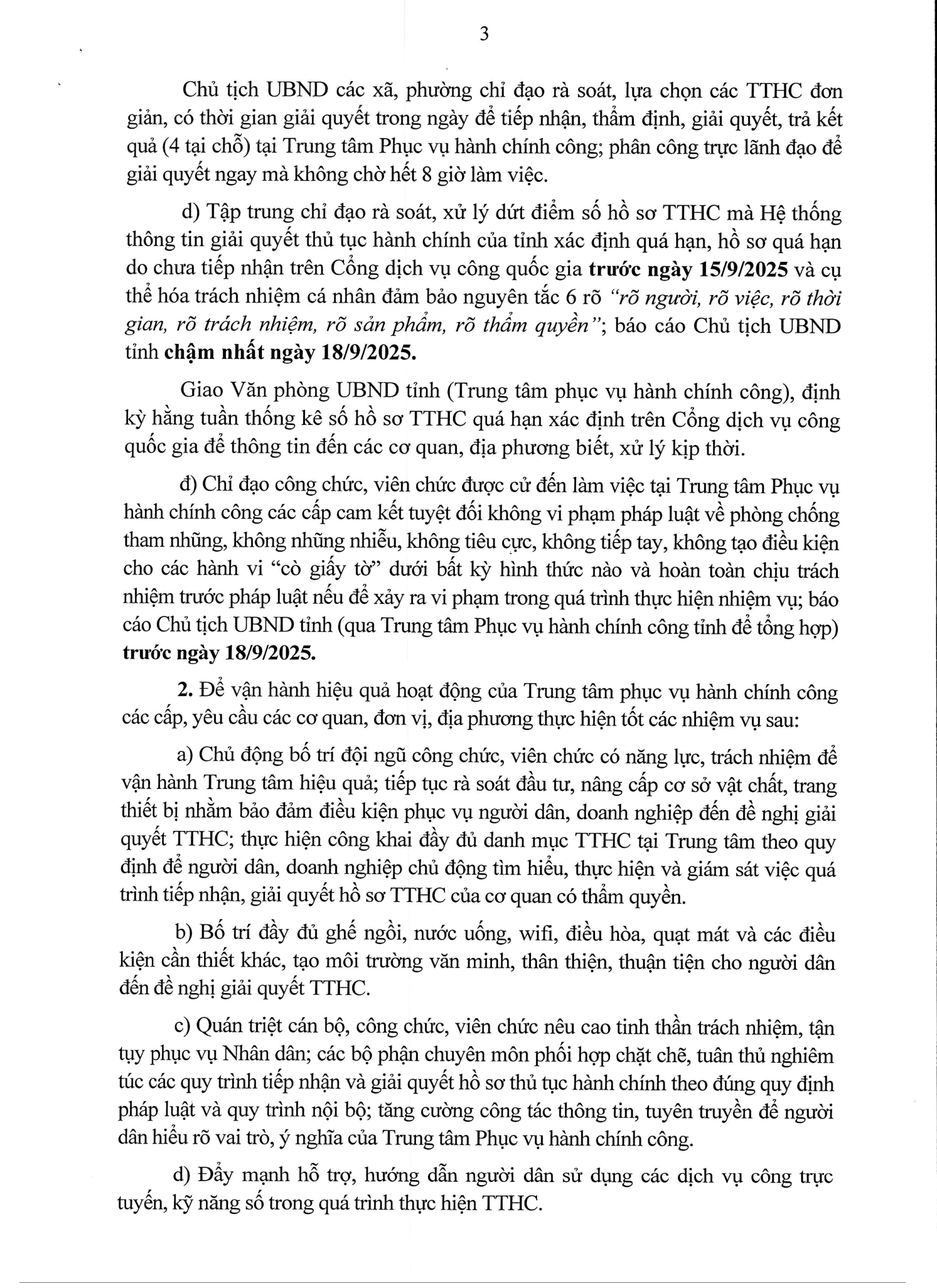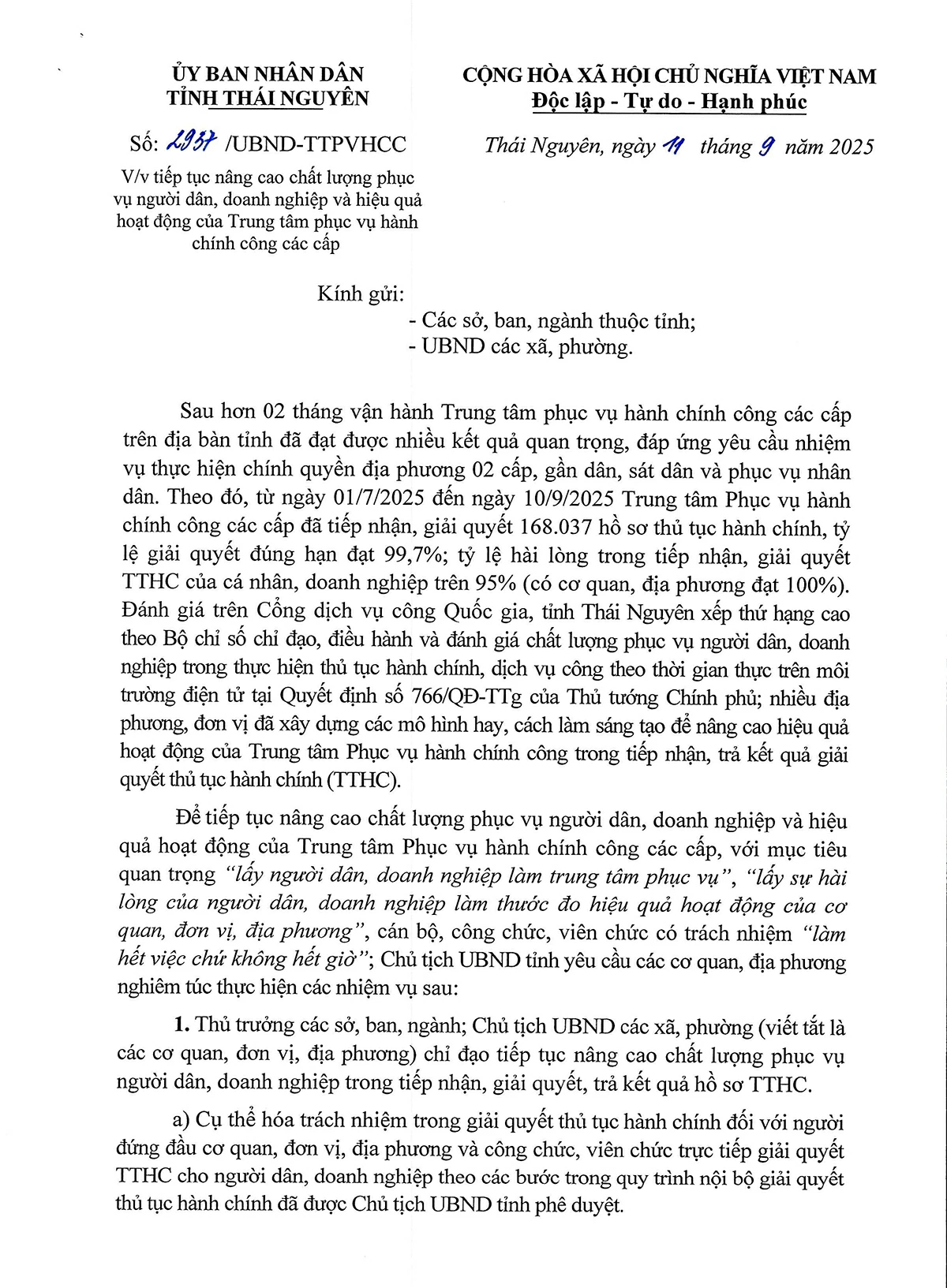 Thời gian qua, việc vận hành Trung tâm Phục vụ hành chính công các cấp trên địa bàn tỉnh Thái Nguyên đã đạt nhiều kết quả quan trọng, góp phần nâng cao hiệu quả hoạt động của chính quyền hai cấp, phục vụ người dân và doanh nghiệp ngày càng tốt hơn. Để tiếp tục phát huy kết quả đạt được, thực hiện mục tiêu “lấy sự hài lòng của người dân, doanh nghiệp làm thước đo”, Chủ tịch UBND tỉnh Thái Nguyên ban hành văn bản chỉ đạo các sở, ban, ngành, UBND các xã, phường triển khai đồng bộ các nhiệm vụ, giải pháp. Dưới đây là toàn văn văn bản.