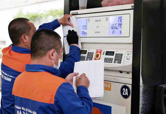 | Kiểm kê xăng dầu trước khi điều chỉnh giá bán. Ảnh: Trần Việt/TTXVN |