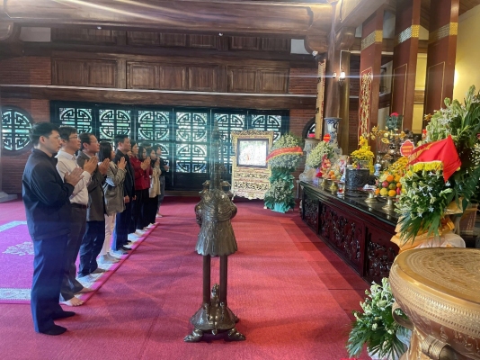 Đoàn dâng hương tại Nhà tưởng niệm Chủ tịch Hồ Chí Minh trên đỉnh đèo De, xã Phú Đình (tỉnh Thái Nguyên)