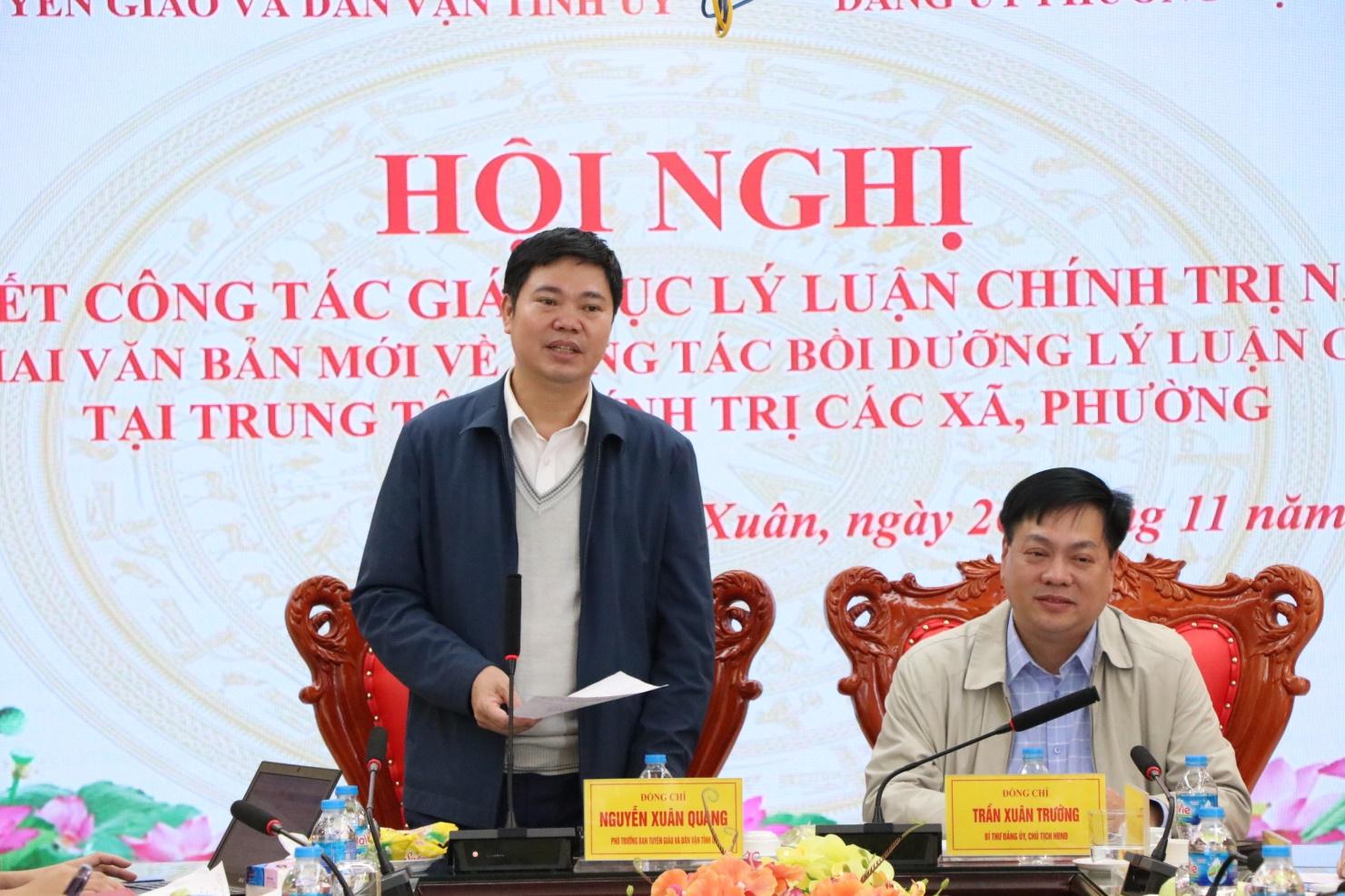 Phát biểu kết luận Hội nghị, đồng chí Nguyễn Xuân Quang, Phó Trưởng ban Tuyên giáo và Dân vận Tỉnh uỷ ghi nhận những nỗ lực và kết quả đạt được của các Trung tâm chính trị trong năm 2025, đặc biệt là sự chủ động đổi mới nội dung, phương pháp giảng dạy và gắn lý luận với thực tiễn cơ sở; đồng thời tiếp thu các ý kiến đề xuất liên quan đến biên chế, tổ chức bộ máy, chế độ, chính sách; tài liệu bồi dưỡng, hướng dẫn chuyên môn; cơ chế phối hợp và tổ chức lớp học.