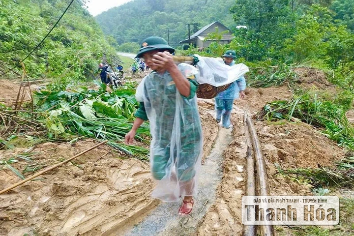 Cán bộ, chiến sĩ Đồn Biên phòng Yên Khương dùng cáng khiêng người dân bị thương trong cơn bão số 5 đi điều trị ở bệnh viện.