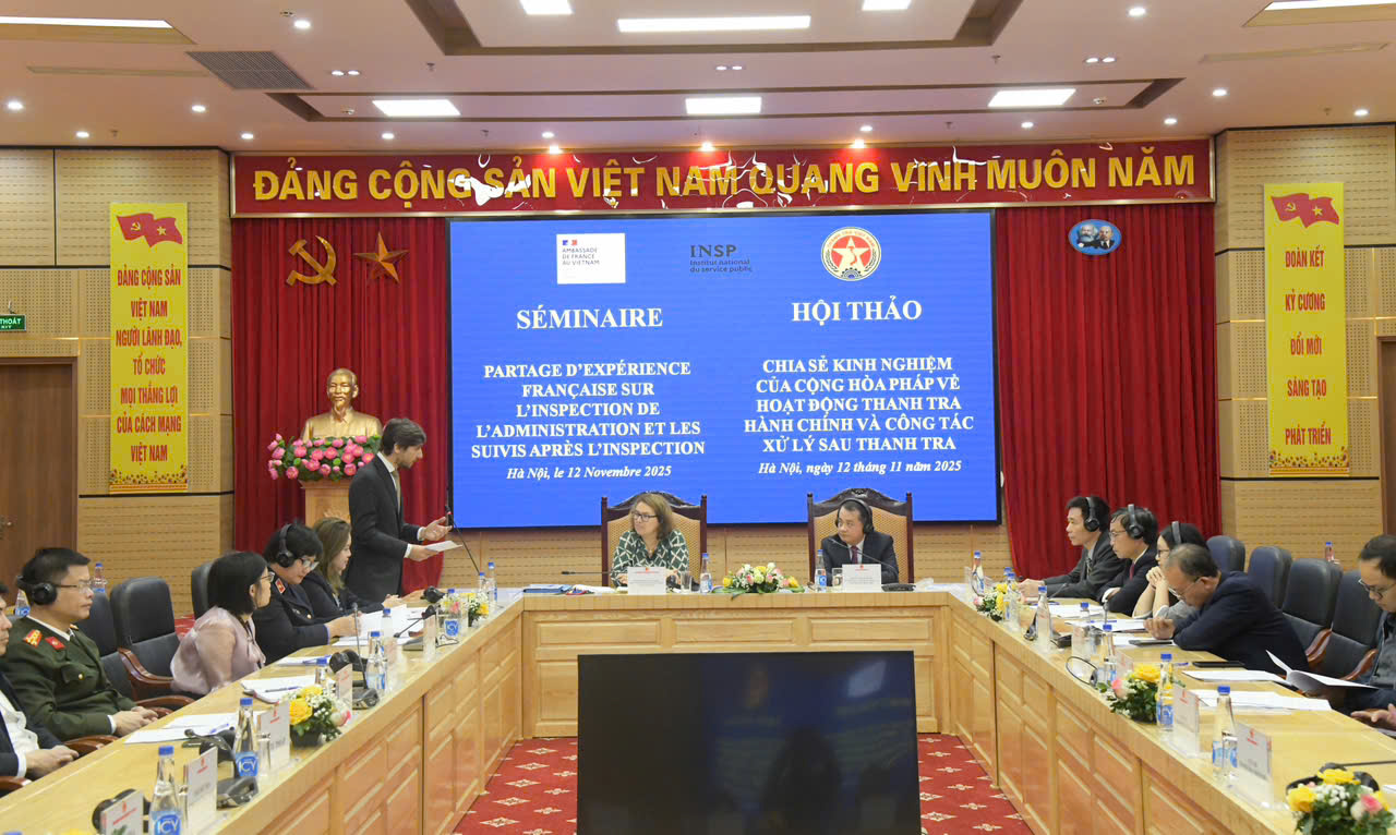 Ngày 12/11, Hội thảo chia sẻ kinh nghiệm của Cộng hòa Pháp về hoạt động thanh tra hành chính và công tác xử lý sau thanh tra, do Thanh tra Chính phủ Việt Nam phối hợp với Đại sứ quán Cộng hòa Pháp tại Việt Nam và Viện Dịch vụ công quốc gia Pháp được tổ chức tại Hà Nội. Dự hội thảo có gần 60 đại biểu đến từ thanh tra các tỉnh Quảng Ninh, Phú Thọ, Hưng Yên, Hà Tĩnh; đại diện Viện Kiểm sát Nhân dân Tối cao, Bộ Tư pháp, Thanh tra Bộ Công an, Thanh tra Bộ Quốc phòng, Thanh tra Ngân hàng Nhà nước cùng lãnh đạo các cục, vụ, đơn vị thuộc Thanh tra Chính phủ.