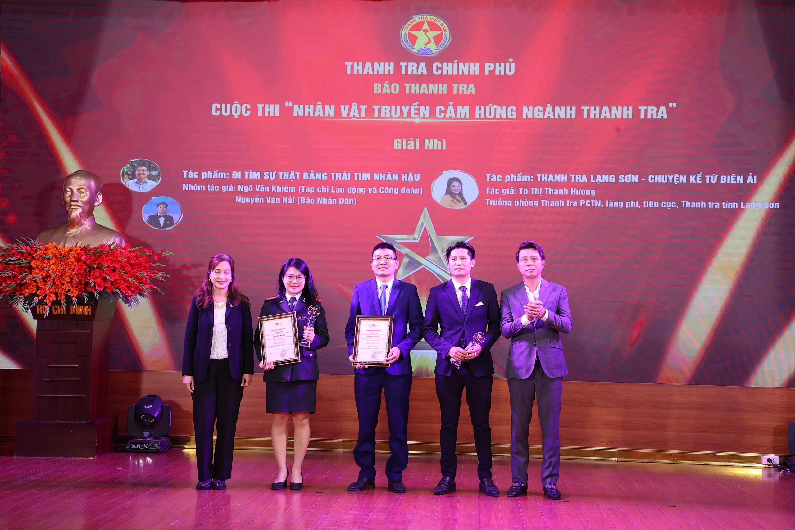 02 giải Nhì được trao cho 02 tác phẩm đó là: Đi tìm sự thật bằng trái tim nhân hậu; Tác giả: Ngô Văn Khiêm, Nguyễn Văn Hải (Tạp chí Lao động và Công đoàn); Nhân vật: Ông Bùi Mạnh Cường, nguyên cán bộ Cục II, Thanh tra Chính phủ và Thanh tra Lạng Sơn - chuyện kể từ biên ải; Tác giả: Tô Thị Thanh Hương (Thanh tra Lạng Sơn); Nhân vật: Tập thể Thanh tra tỉnh Lạng Sơn.