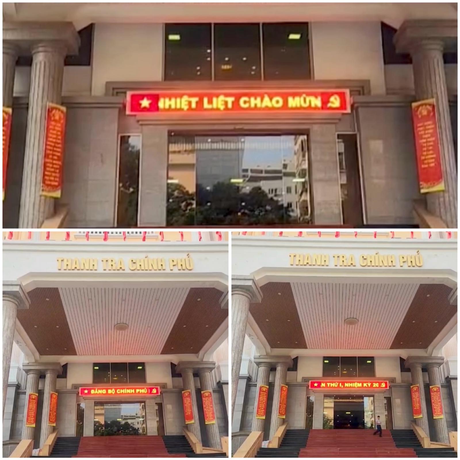 Màn hình Led tại trụ sở làm việc của Thanh tra Chính phủ luôn hiển thị dòng chữ: “NHIỆT LIỆT CHÀO MỪNG ĐẠI HỘI ĐẢNG BỘ CHÍNH PHỦ LẦN THỨ I, NHIỆM KÌ 2025-2030”. Ảnh: Thanh Thanh