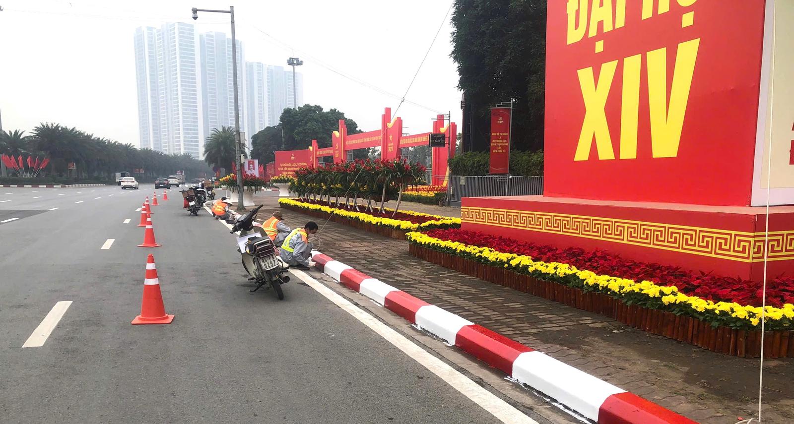 Công tác sơn kẻ và điều chỉnh tổ chức giao thông được triển khai tại khu vực xung quanh Trung tâm Hội nghị Quốc gia - nơi diễn ra Đại hội XIV của Đảng. Ảnh: MD