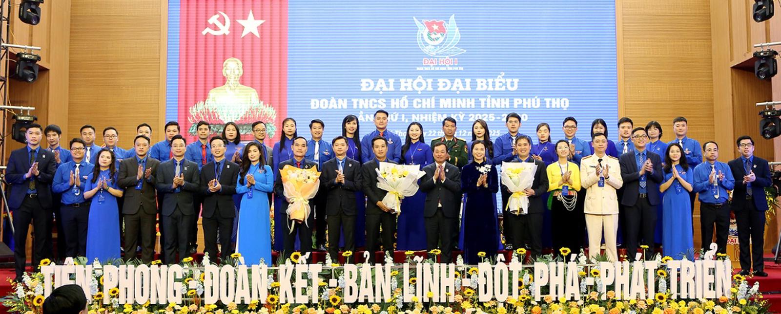 Phó Bí thư Thường trực Tỉnh ủy Bùi Văn Quang; Phó Bí thư Tỉnh ủy, Chủ tịch Ủy ban MTTQ tỉnh Bùi Thị Minh và Bí thư Thường trực Trung ương Đoàn Nguyễn Minh Triết chụp ảnh lưu niệm cùng Ban Chấp hành Đoàn TNCS Hồ Chí Minh tỉnh Phú Thọ khóa I, nhiệm kỳ 2025 – 2030. Ảnh: Ngọc Kiên