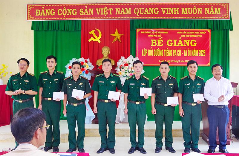 Đại tá Đặng Ngọc Hiệu - Bí thư Đảng uỷ, Chính uỷ Ban Chỉ huy BĐBP và ông Lê Đình Chinh - Giám đốc trung tâm giáo dục nghề nghiệp, giáo dục thường xuyên khu vực 4, thành phố Huế trao giấy khen cho các cá nhân đạt thành tích xuất sắc.