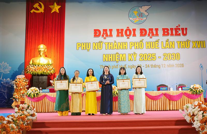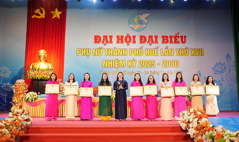Dịp này, 5 tập thể và 10 cá nhân được nhận Bằng khen UBND TP Huế trao tặng, 50 tập thể và 41 cá nhân được tặng Bằng khen Ban Thường vụ Hội LHPN TP Huế trao tặng đạt thành tích xuất sắc trong thực hiện nhiệm vụ công tác Hội và phong trào phụ nữ nhiệm kỳ 2021-2025.