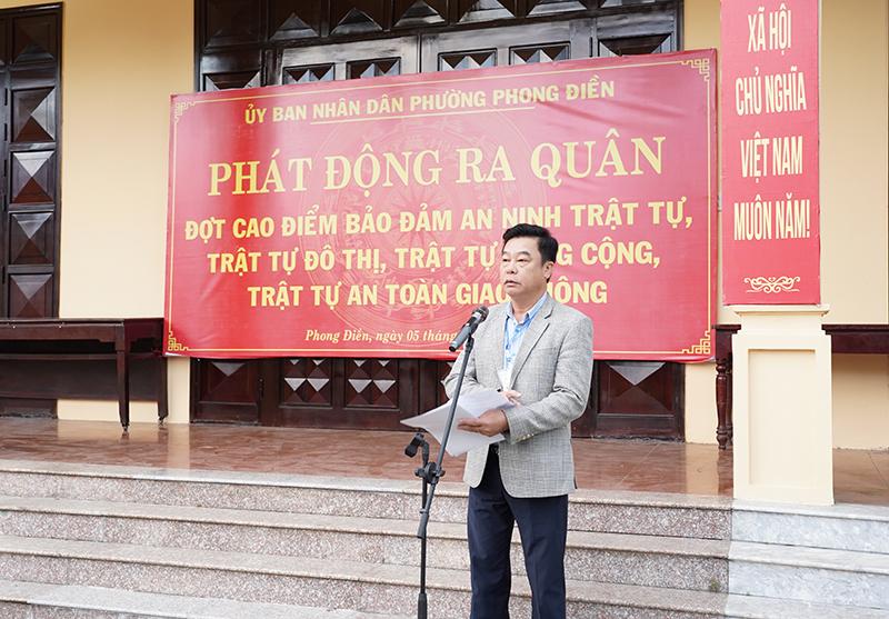 Phát biểu tại buổi lễ phát động, thay mặt lãnh đạo UBND phường ông Nguyễn Hữu Chung, Phó Giám đốc Trung tâm Dịch vụ sự nghiệp công phường nhấn mạnh tầm quan trọng của đợt ra quân cao điểm đảm bảo an ninh trật tự, trật tự đô thi, trật tự công cộng, trật tự an toàn giao thông trên địa bàn phường góp phần xây dựng phường Phong Điền văn minh, an toàn, sạch đẹp.