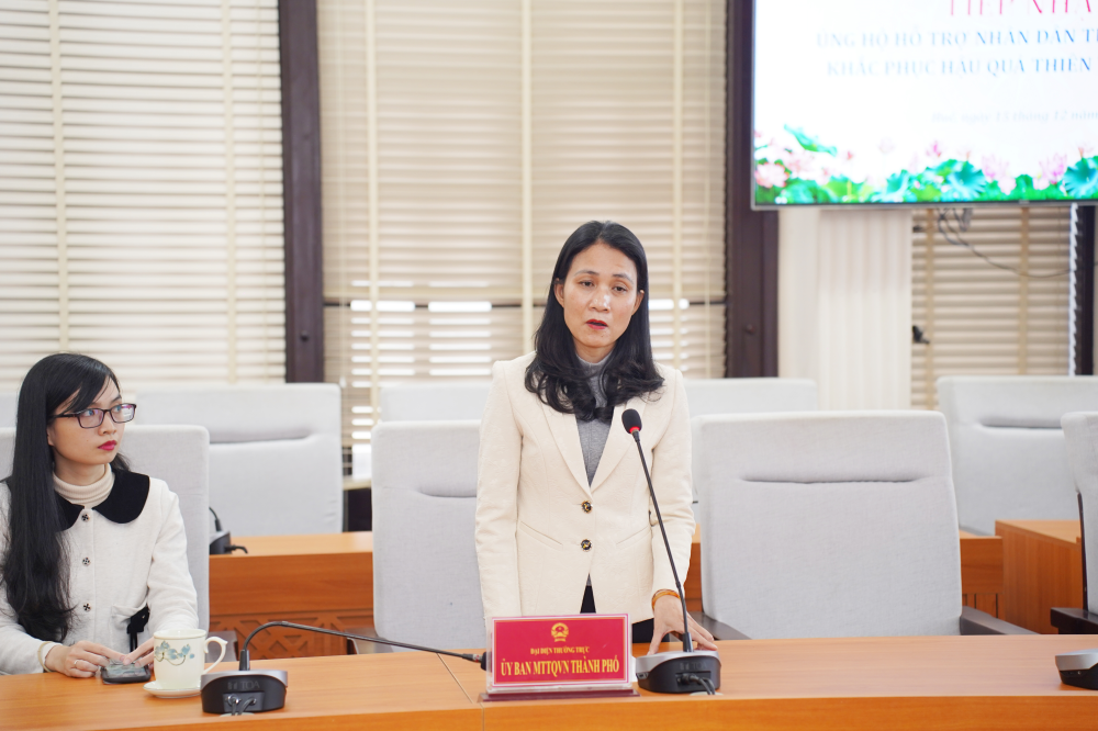 Phát biểu tại buổi tiếp nhận, Phó Chủ tịch Ủy ban MTTQ Việt Nam thành phố Huế Phạm Thị Ái Nhi cho biết, trong thời gian qua, thành phố Huế đã tập trung chỉ đạo quyết liệt công tác khắc phục hậu quả bão lụt, ưu tiên hỗ trợ người dân sớm ổn định đời sống, khôi phục sản xuất, kinh doanh, bảo đảm an sinh xã hội và từng bước phục hồi các hoạt động kinh tế – xã hội trên địa bàn.