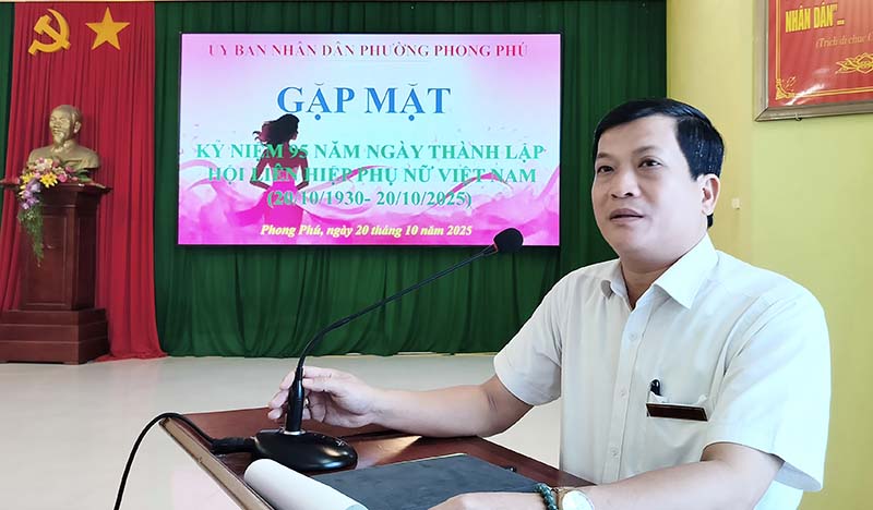 Sáng 20/10, UBND phường Phong Phú tổ chức gặp mặt kỷ niệm 95 năm Ngày thành lập Hội Liên hiệp Phụ nữ Việt Nam (20/10/1930 - 20/10/2025) và Ngày Phụ nữ Việt Nam 20/10. Dự buổi gặp mặt có đồng chí Nguyễn Ngọc Vũ, Phó Bí thư Thường trực Đảng ủy; đồng chí Nguyễn Văn Dũng, Phó Bí thư Đảng ủy, Chủ tịch UBND phường; cùng các đồng chí đại diện Thường trực HĐND, UBND phường, lãnh đạo và cán bộ, công chức, viên chức là nữ đang công tác tại các phòng, đơn vị của phường.