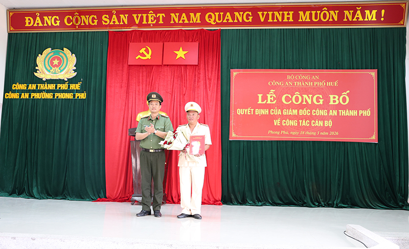 Tại buổi Lễ, Công an thành phố Huế đã công bố và trao Quyết định số 1964/QĐ-CATP, ngày 17/3/2026 về việc điều động đồng chí Trung tá Trần Lưu Thủy, Phó Đội trưởng Đội Kỹ thuật phòng, chống tội phạm - Phòng Kỹ thuật hình sự Công an thành phố Huế giữ chức vụ Phó Trưởng Công an phường Phong Phú.