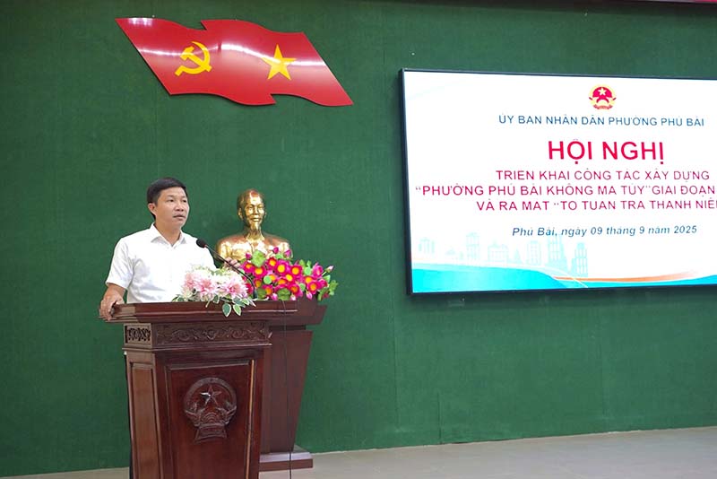 Ngày 9/9, UBND phường Phú Bài tổ chức hội nghị triển khai công tác xây dựng “phường không ma túy” giai đoạn 2025-2030 và ra mắt “Tổ tuần tra Thanh niên”. Tham dự có đồng chí Lê Văn Cường - Bí thư Đảng ủy, Chủ tịch HĐND phường; đồng chí Lê Bá Minh Hải - Phó Bí thư Đảng ủy, Chủ tịch UBND phường; đồng chí Phan Hữu Sơn - UVTV Đảng ủy, Phó Chủ tịch UBND phường; lãnh đạo các phòng, ban, ngành, đoàn thể phường; bí thư chi bộ, tổ trưởng tổ dân phố, tổ trưởng tổ an ninh cơ sở trên địa bàn.