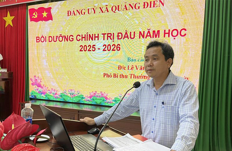 Nhằm nâng cao nhận thức về chính trị, tư tưởng, nâng cao trình độ lý luận và bản lĩnh chính trị cho đội ngũ cán bộ, giáo viên trước thềm năm học mới. Sáng 20/8, Đảng ủy xã Quảng Điền tổ chức khai giảng lớp bồi dưỡng Lý luận chính trị hè năm 2025 cho đội ngũ cán bộ, giáo viên, nhân viên các đơn vị trường học trên địa bàn xã. Tham dự có đồng chí Lê Ngọc Bảo – Bí thư Đảng uỷ, Chủ tịch HĐND xã, đồng chí Lê Văn Khuyến – Phó Bí thư Thường trực Đảng uỷ, các đồng chí lãnh đạo các cơ quan ban ngành cấp xã, cùng đông đảo đội ngũ cán bộ, giáo viên, nhân viên ngành giáo dục trên địa bàn xã.