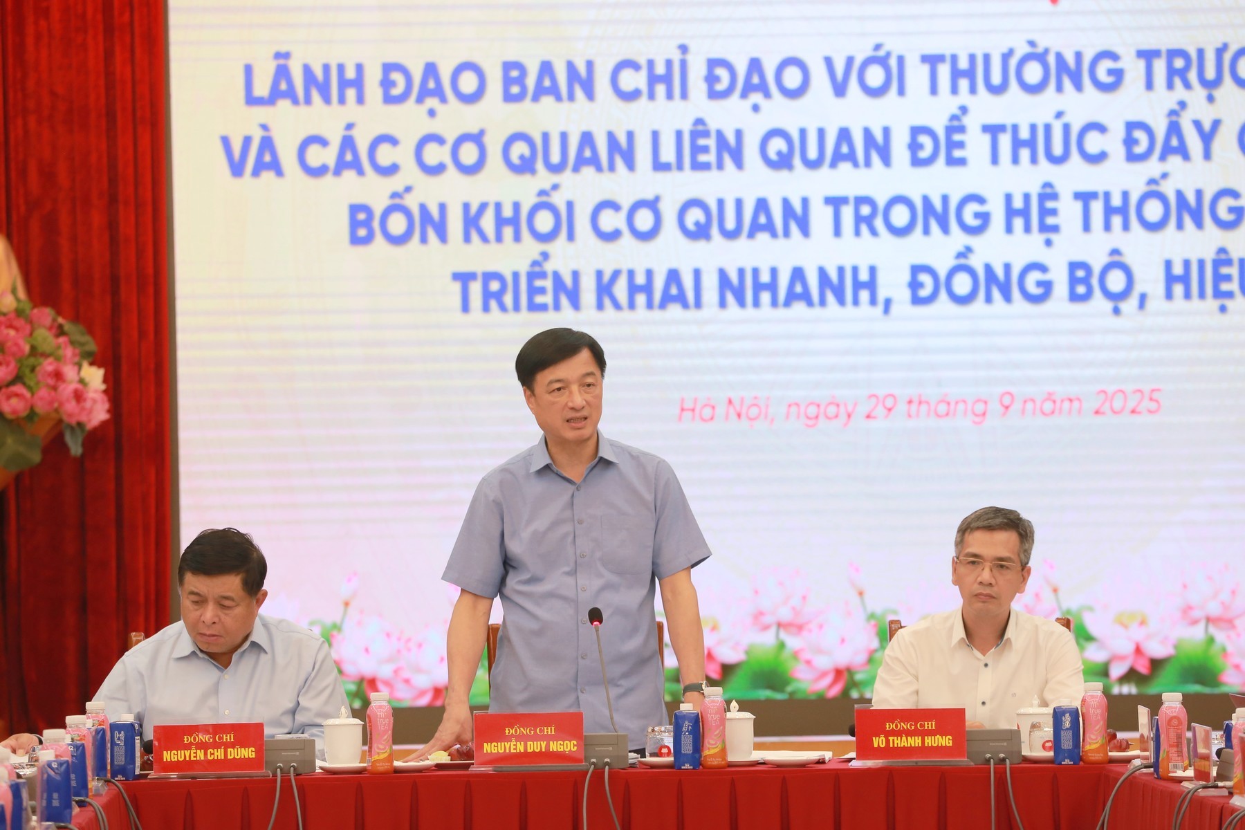 Đồng chí Nguyễn Duy Ngọc nêu rõ, để kịp thời giải quyết các khó khăn, vướng mắc, điểm nghẽn, lãnh đạo Ban Chỉ đạo đề nghị các bộ, cơ quan Trung ương và địa phương trên 04 khối cơ quan của hệ thống chính trị cần khẩn trương thực hiện những nhiệm vụ, theo Kế hoạch đã đề ra.