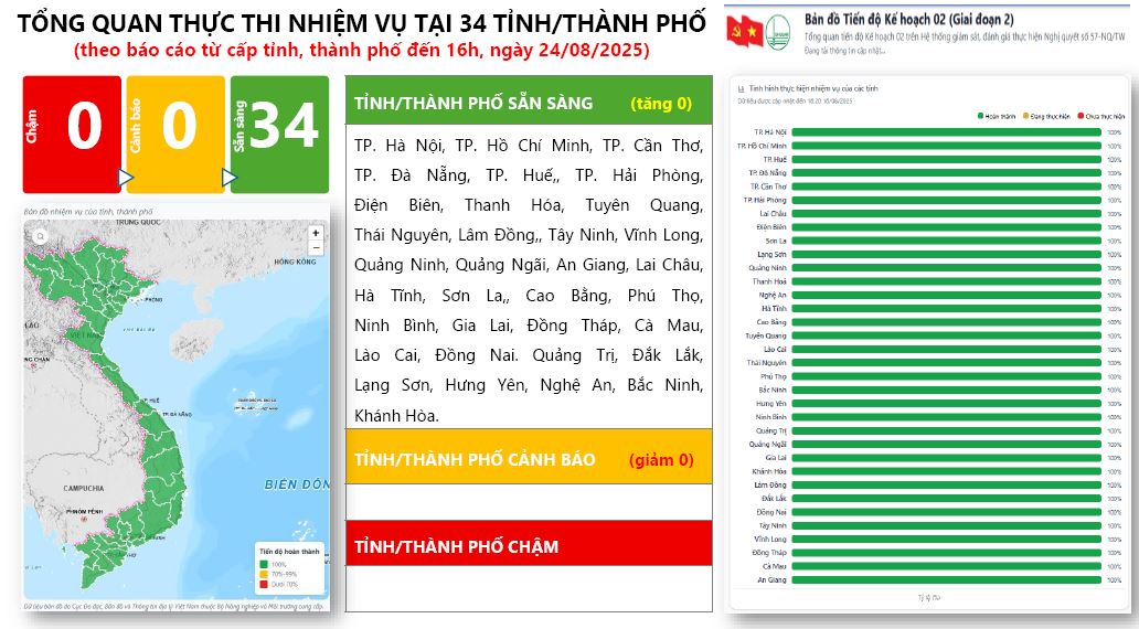 Theo báo cáo của Cơ quan Thường trực Ban Chỉ đạo Trung ương về phát triển khoa học, công nghệ, đổi mới sáng tạo và chuyển đổi số, dữ liệu các địa phương báo cáo trên Hệ thống giám sát, đánh giá việc triển khai thực hiện Nghị quyết số 57-NQ/TW tính đến 16h00 ngày 24/8/2025, có 34/34 tỉnh, thành phố đạt trạng thái XANH (hoàn thành nhiệm vụ). Không có tỉnh, thành phố nào ở trạng thái chưa hoàn thành nhiệm vụ.