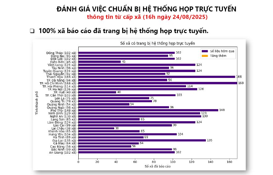 Có tới 11 tỉnh, thành phố có 100% số xã, phường hoàn thành nhiệm vụ. Hà Nội là địa phương có tỉ lệ hồ sơ nộp trực tuyến đã đạt rất cao (92,11%), số hồ sơ đã trả đạt 2,69% so với tổng số hồ sơ cùng ngày.