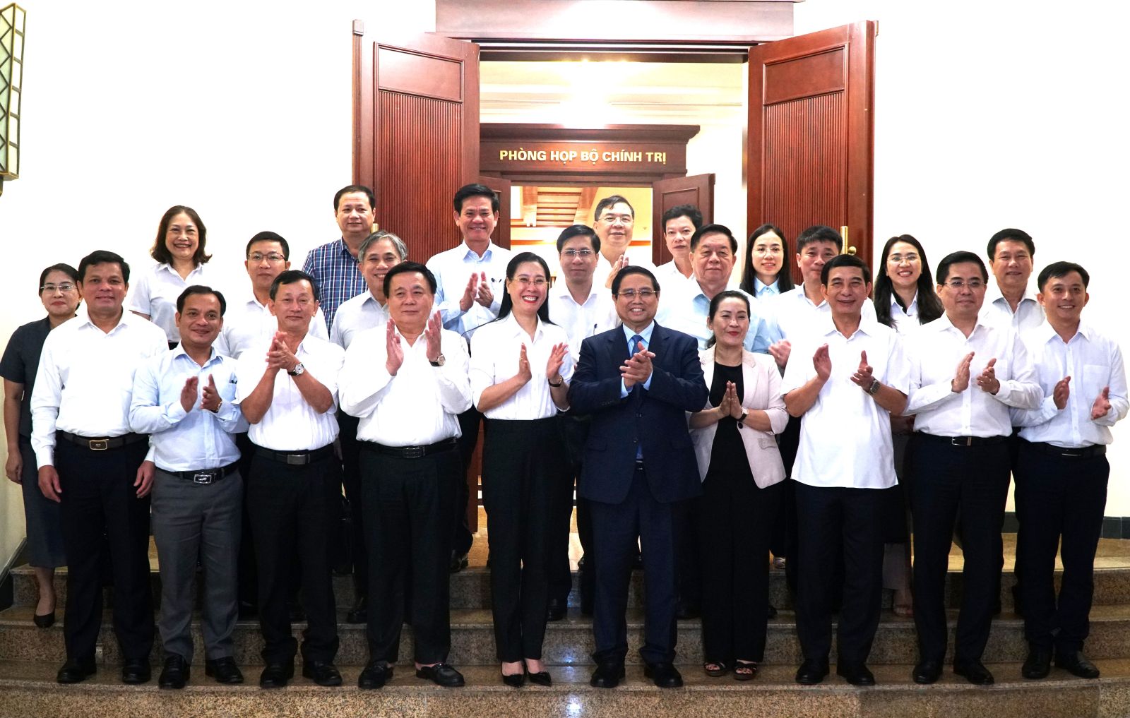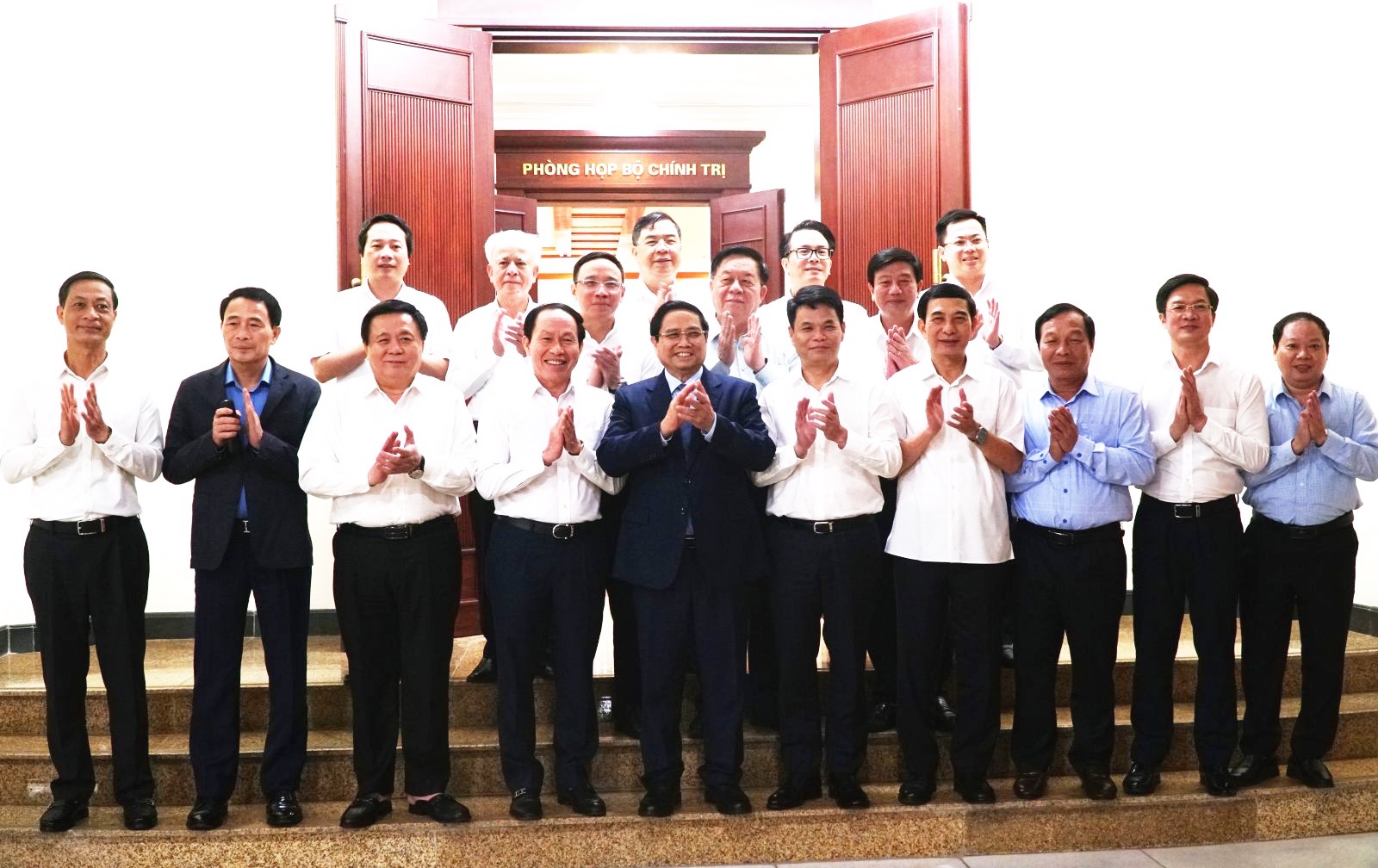 Thủ tướng Chính phủ Phạm Minh Chính và các đồng chí Ủy viên Bộ Chính trị, Bí thư Trung ương Đảng chụp ảnh lưu niệm cùng Ban Thường vụ Tỉnh ủy Quảng Ngãi.